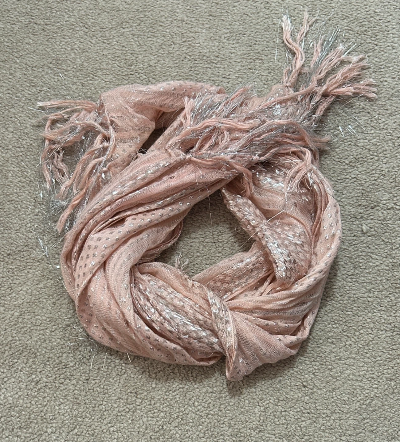 18A pretty pink scarf with subtle silver accents. It's lightweight and perfect for adding a touch of sparkle to any outfit!