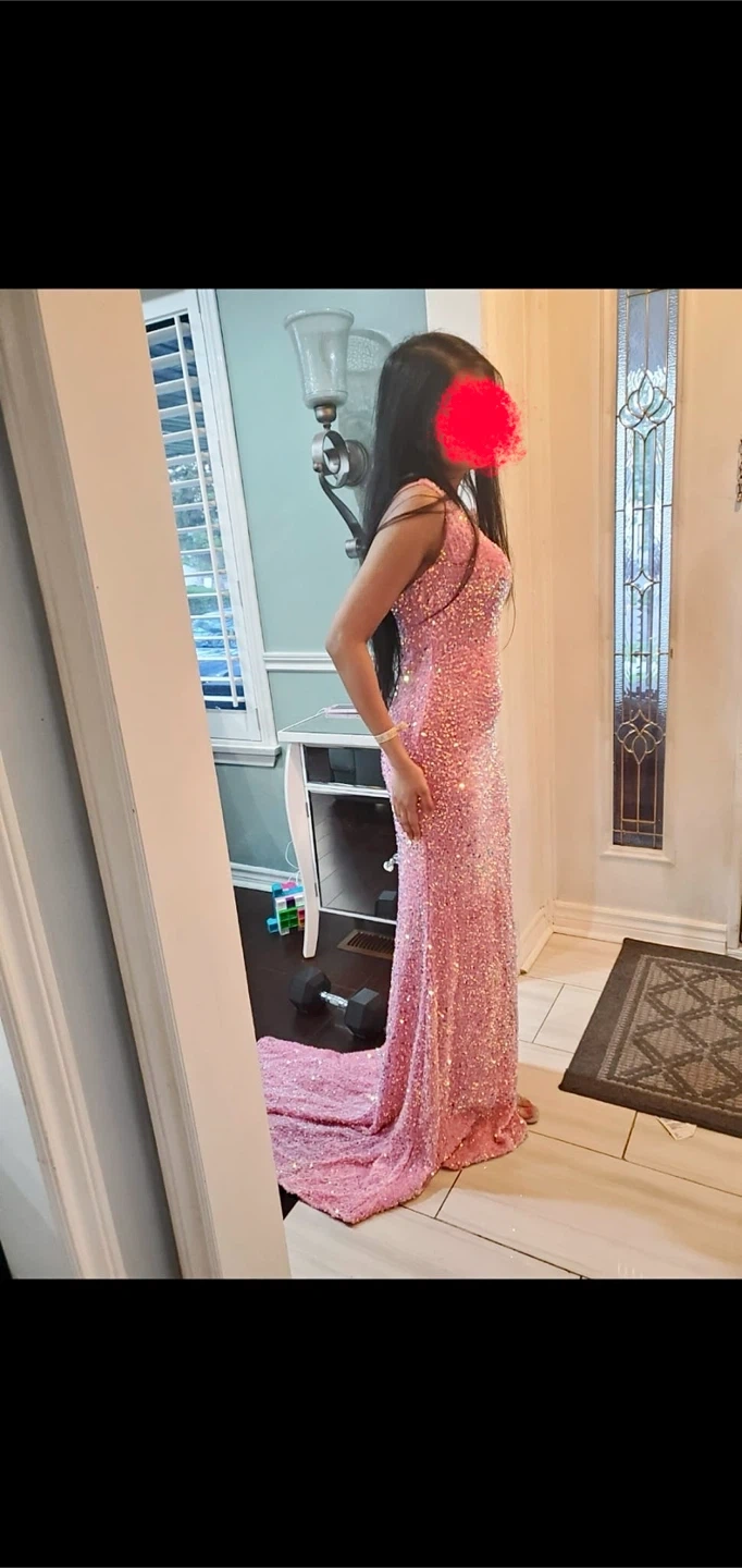 81This listing is for an authentic formal gown. Brand: Style: One-shoulder design, sequin overlay, column/sheath silhouette, thigh-high side slit, and an open back. Color: Blush Pink Material: Sequin fabric Size: 4 pick up in Etobicoke area