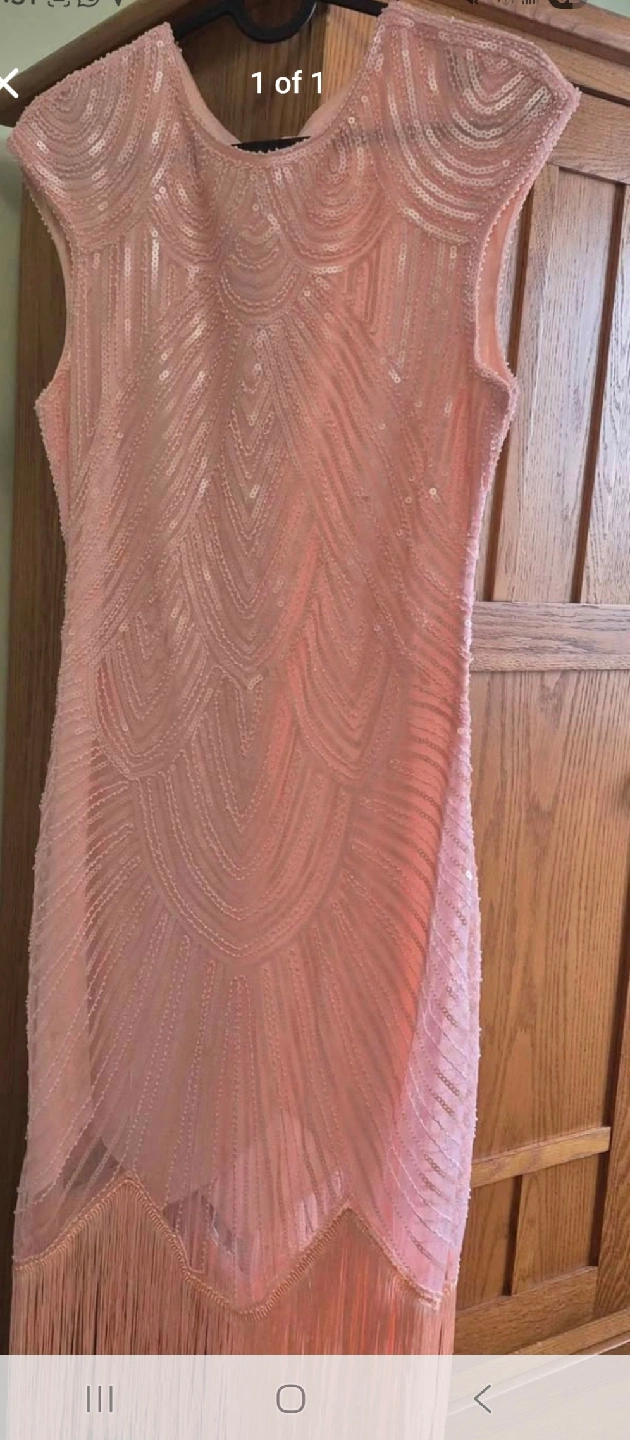 Selling a lovely pink sequin dress with a fun fringe detail! It's perfect for a special occasion or a night out. The dress has a unique art deco-inspired design with shimmering sequins that catch the light beautifully. It's in great condition and ready for a new home