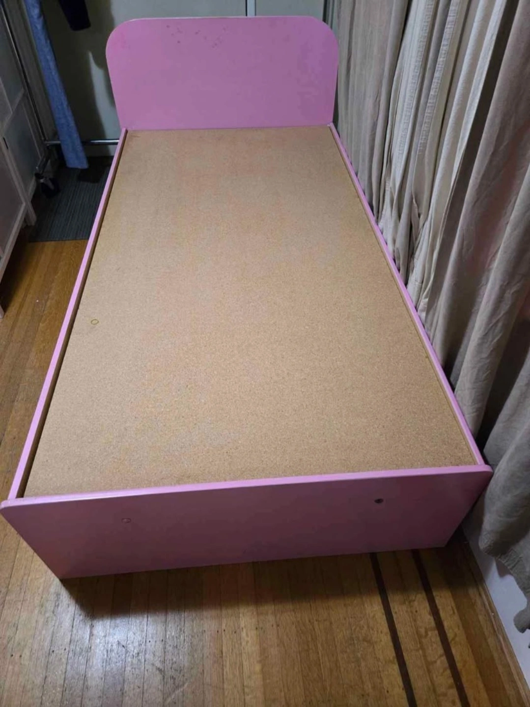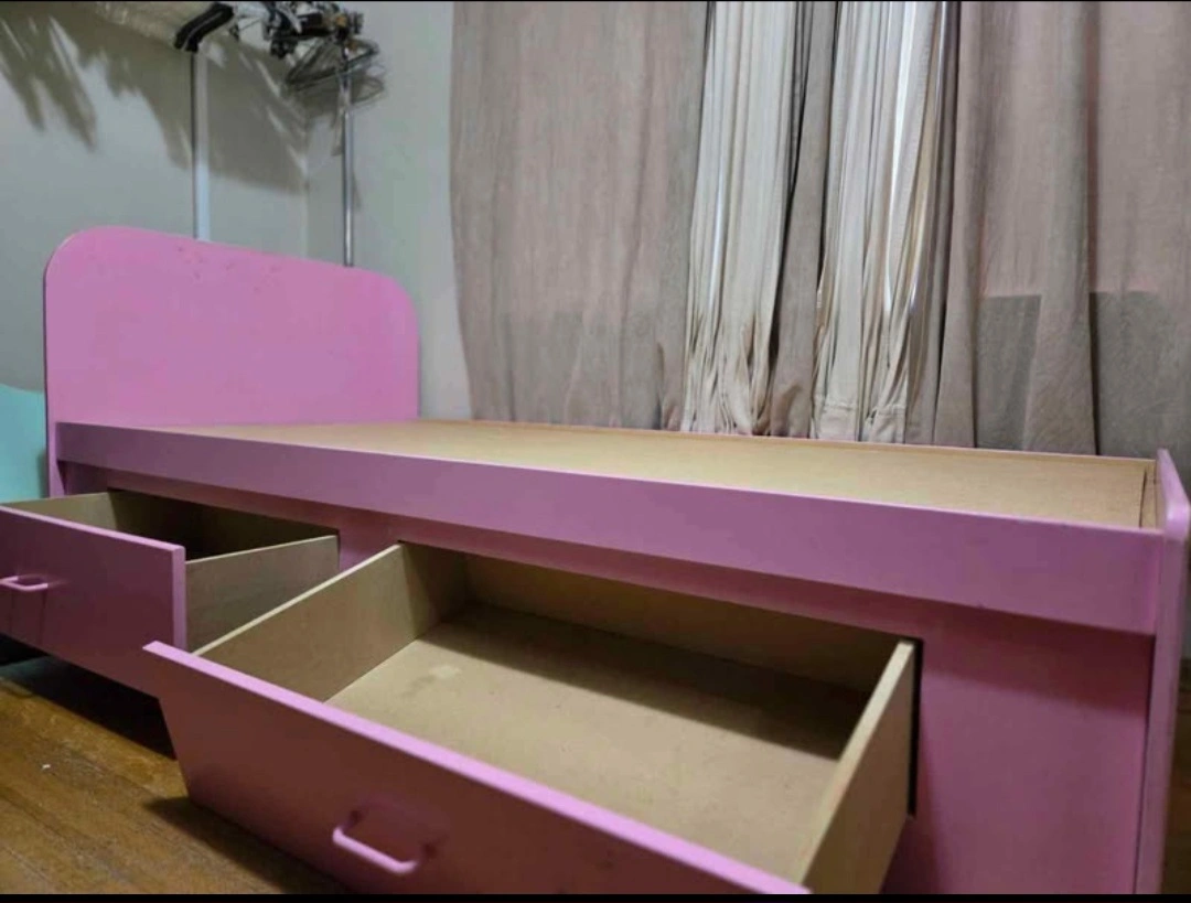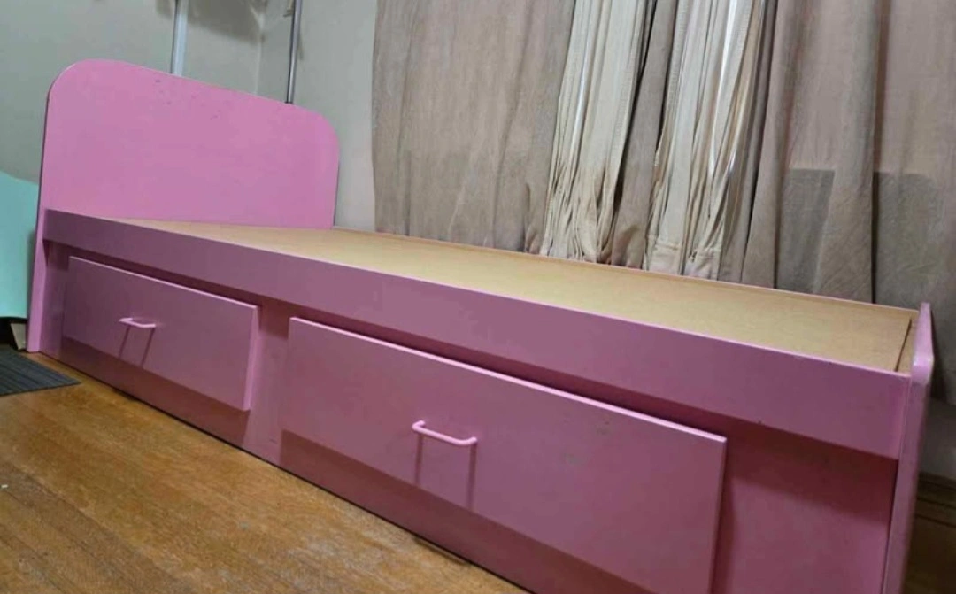 Selling a cute pink single bed frame! It comes with handy drawers underneath for extra storage. Perfect for a smaller space. It's in good condition and ready for a new home! it's a custom.made and pick up only