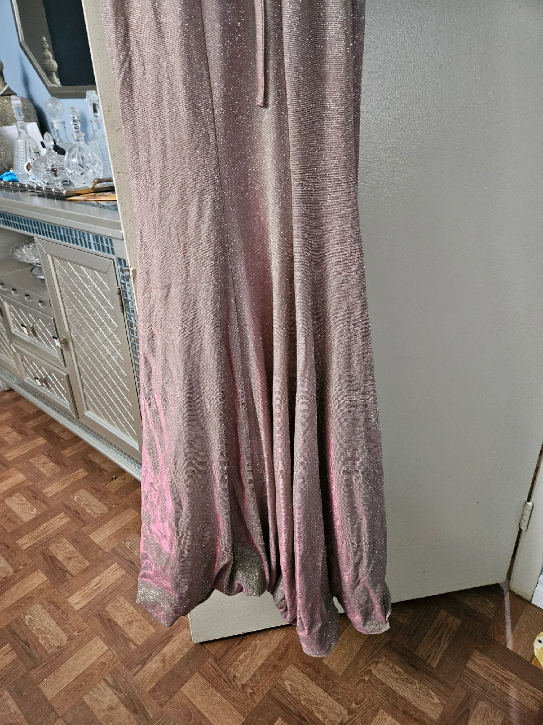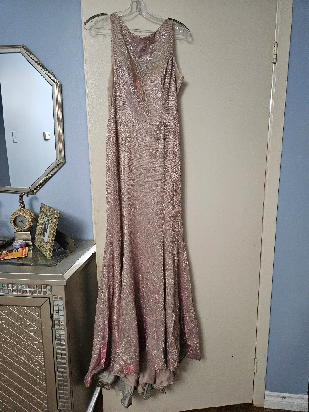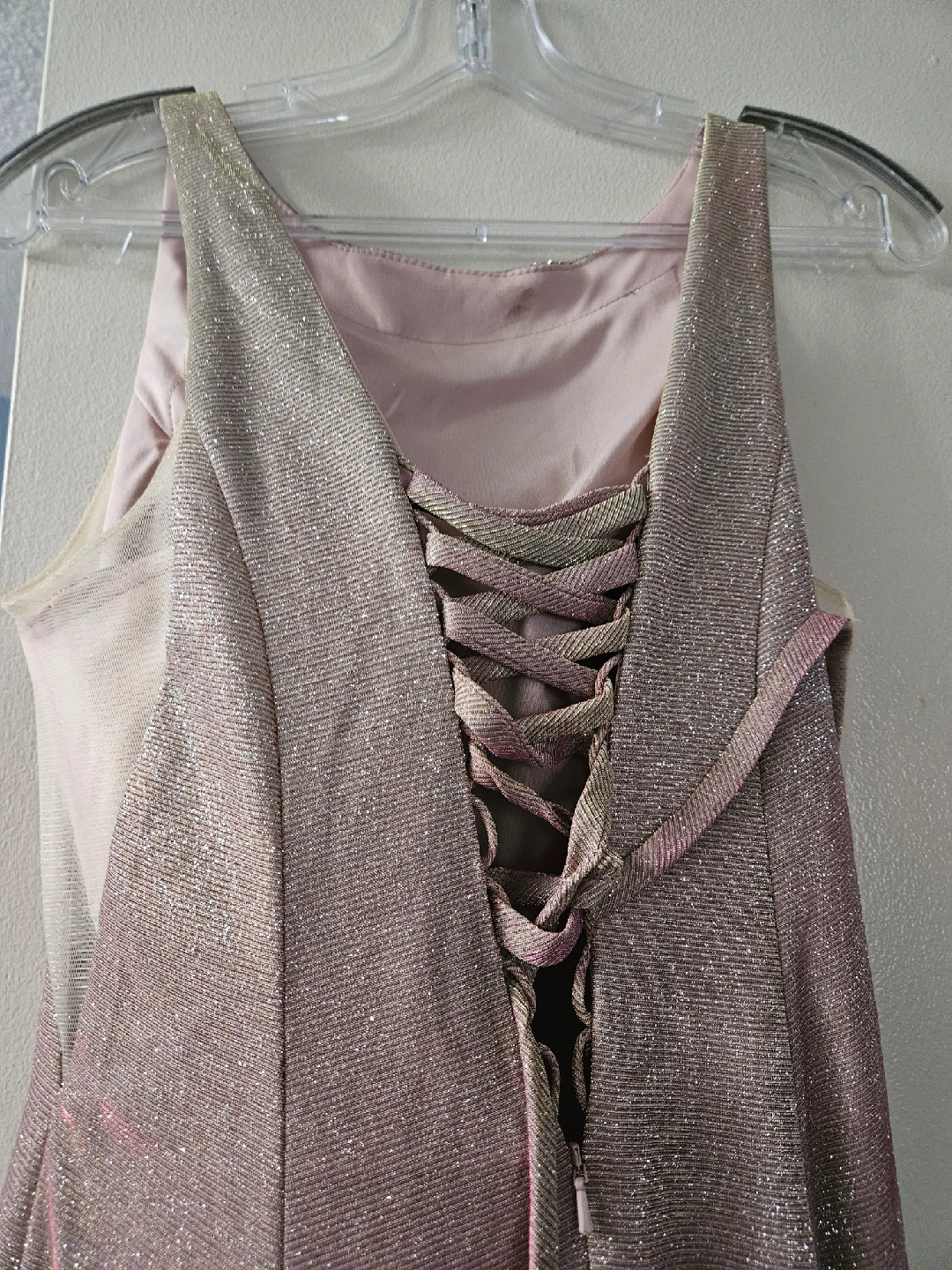 Selling a lovely pink sparkly evening gown. It has a fitted design and a lace-up back. It's in great condition and would be perfect for a special occasion!