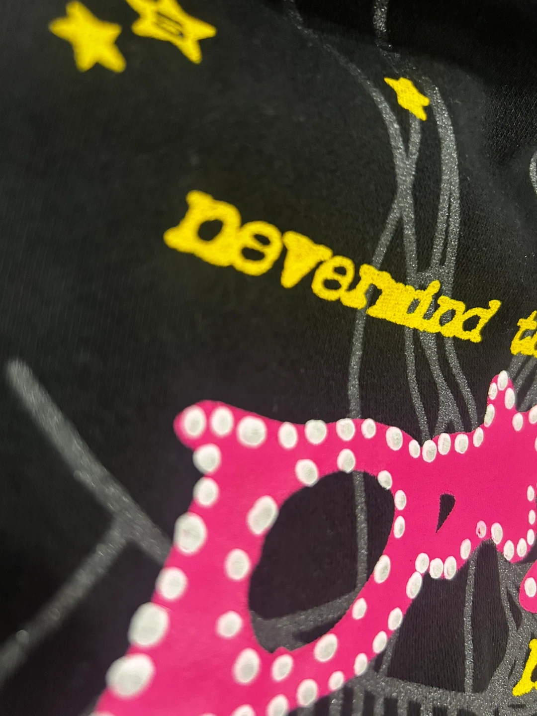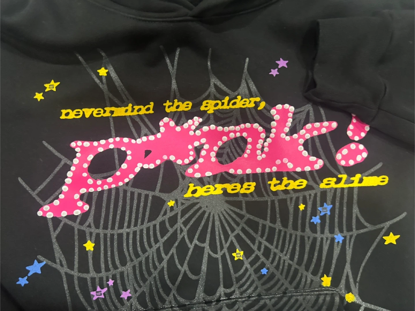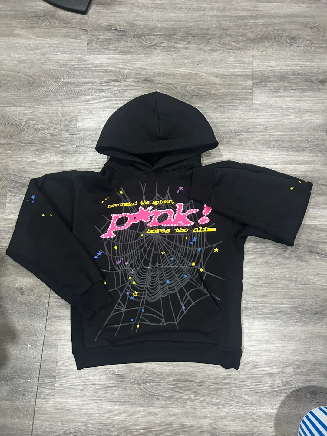 Selling a black hoodie with a 'Pink! Nevermind the spider, here's the slime' graphic! It features a spiderweb design with colourful stars. A fun and unique piece for your wardrobe