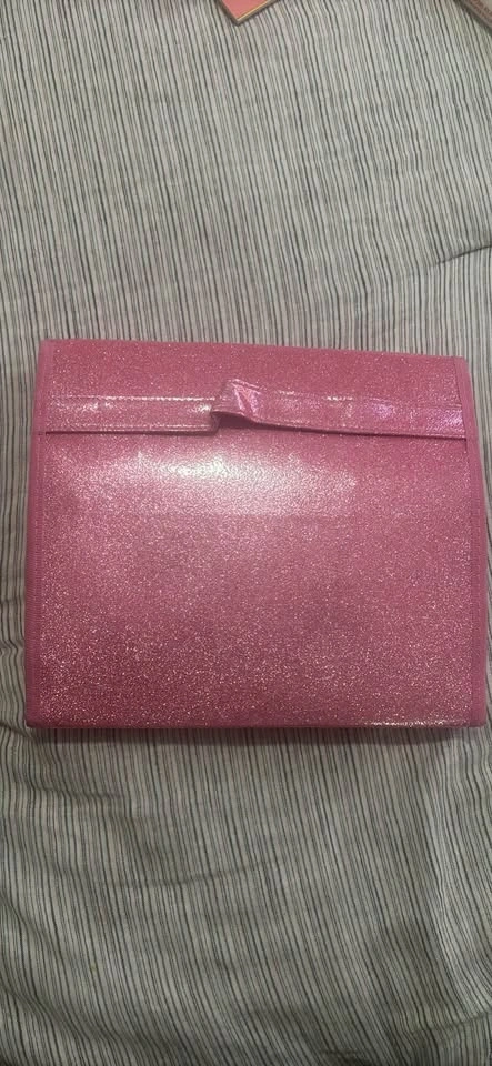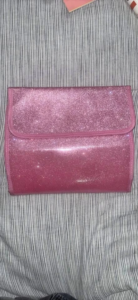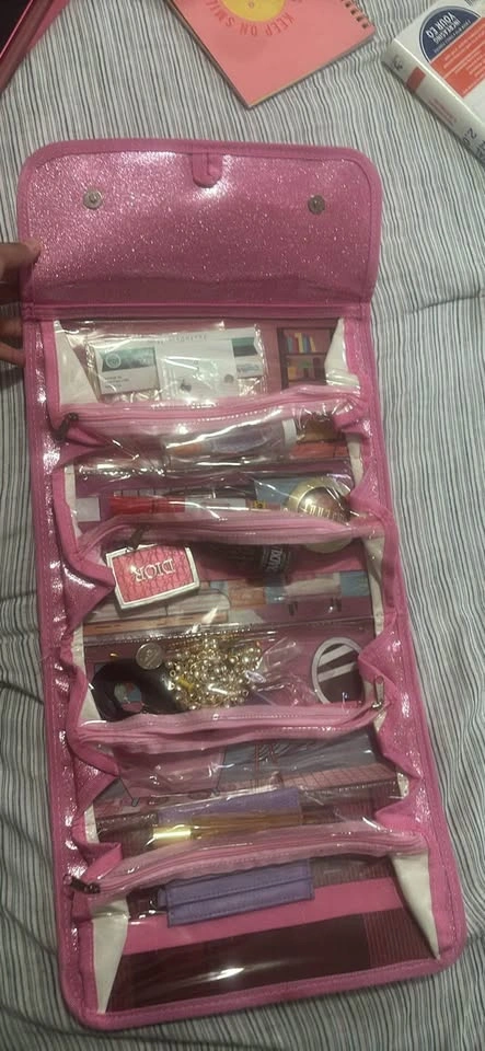 10Pink storage glittery bag. It has 4 zips. U can keep makeup stuff or anything u want.
