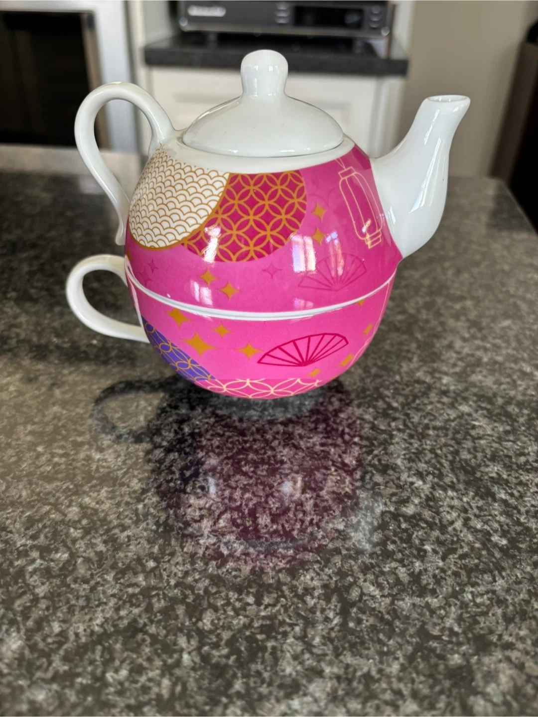 Selling a cute pink tea pot with a matching cup! It has a lovely design with gold and purple accents. Perfect for a cozy tea time or just as an adorable showpiece.