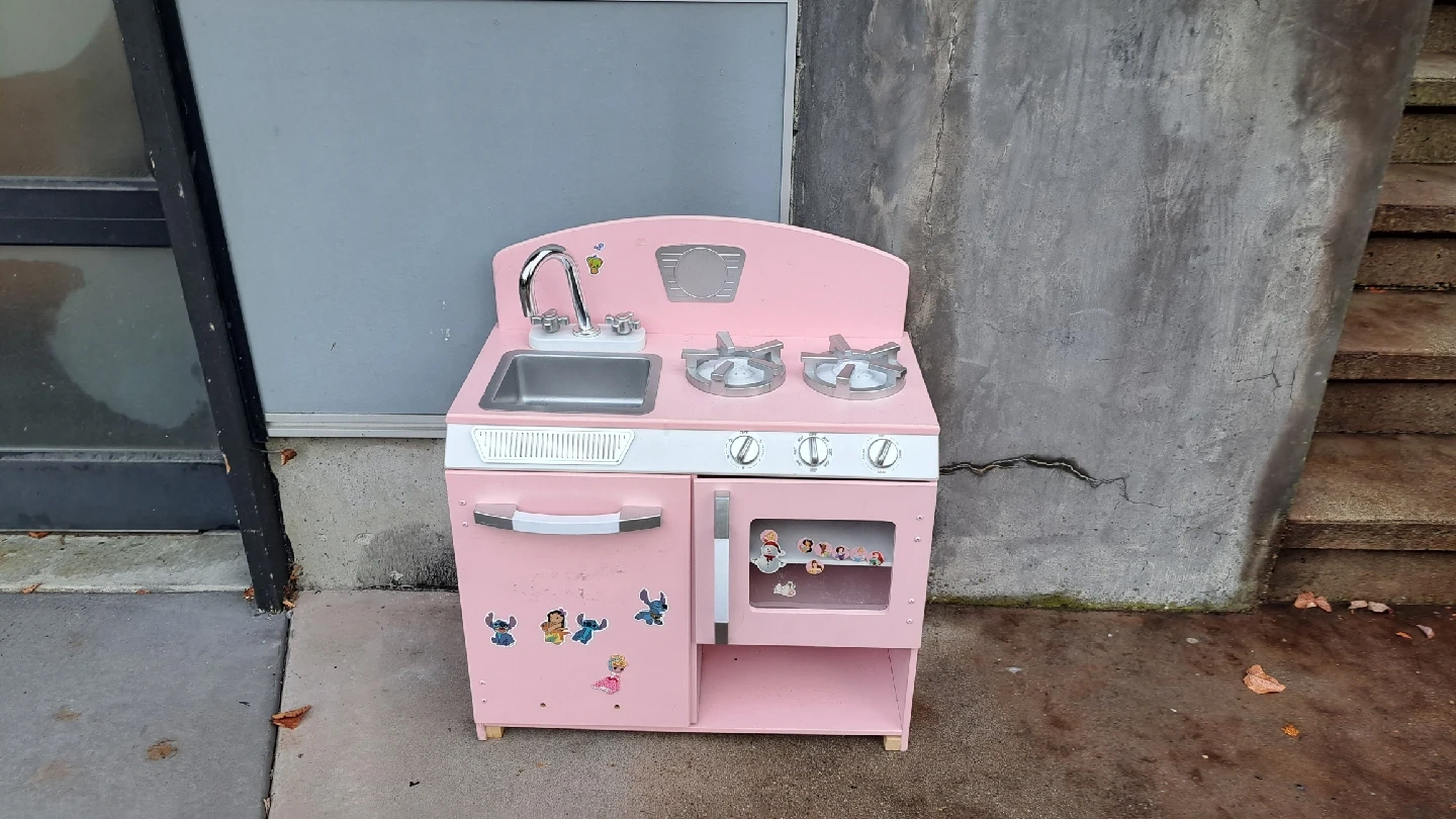 70Selling a cute pink toy kitchen, perfect for little chefs! It comes with a sink, stove, and oven. Also included is a box full of play food and accessories, so your child can start cooking right away