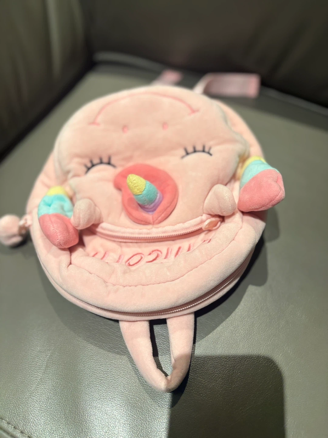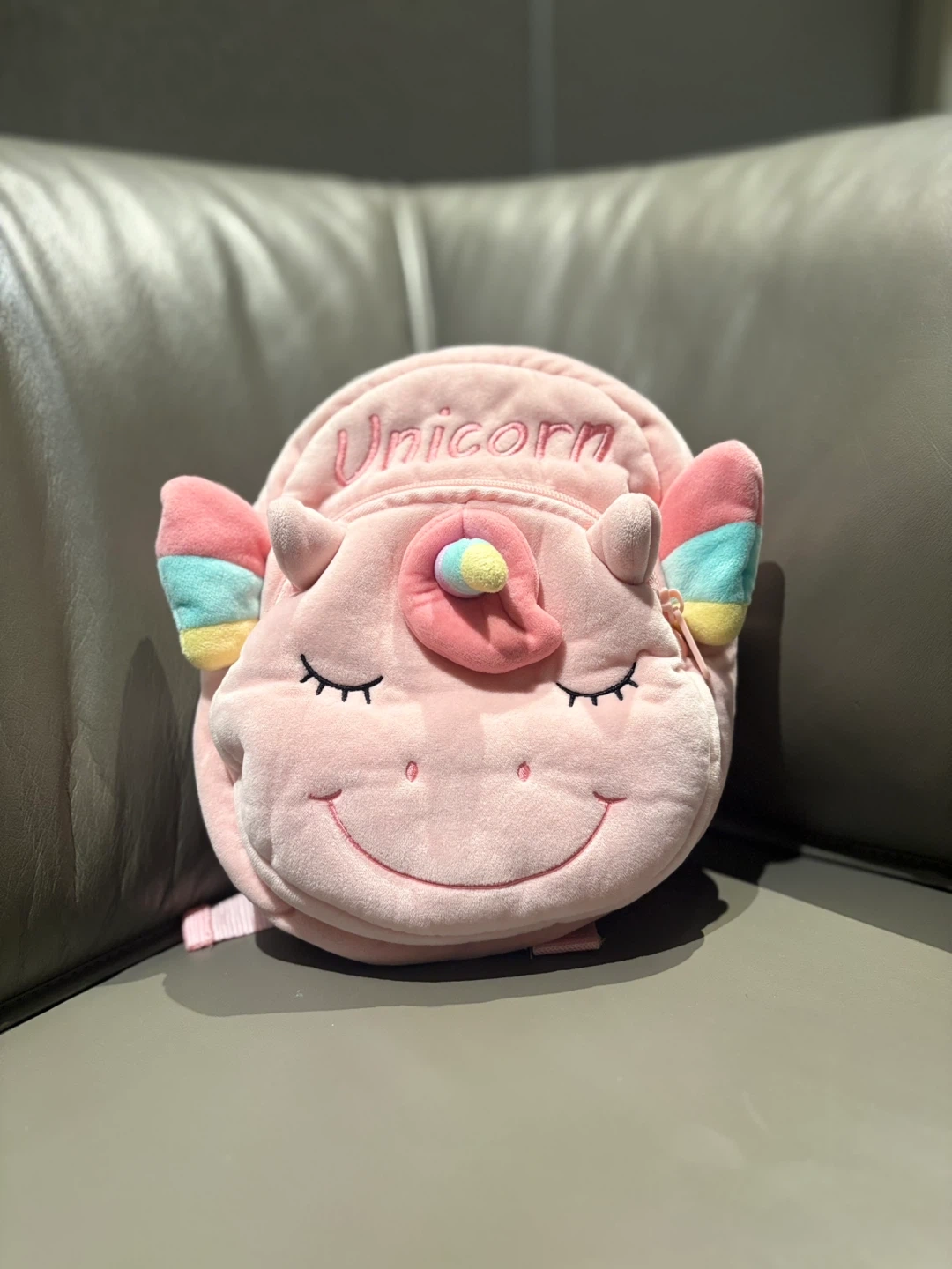 A super cute pink unicorn backpack for your little one! It's made of soft plush material and features a smiling unicorn face with rainbow accents. Perfect for carrying toys or snacks on outings!