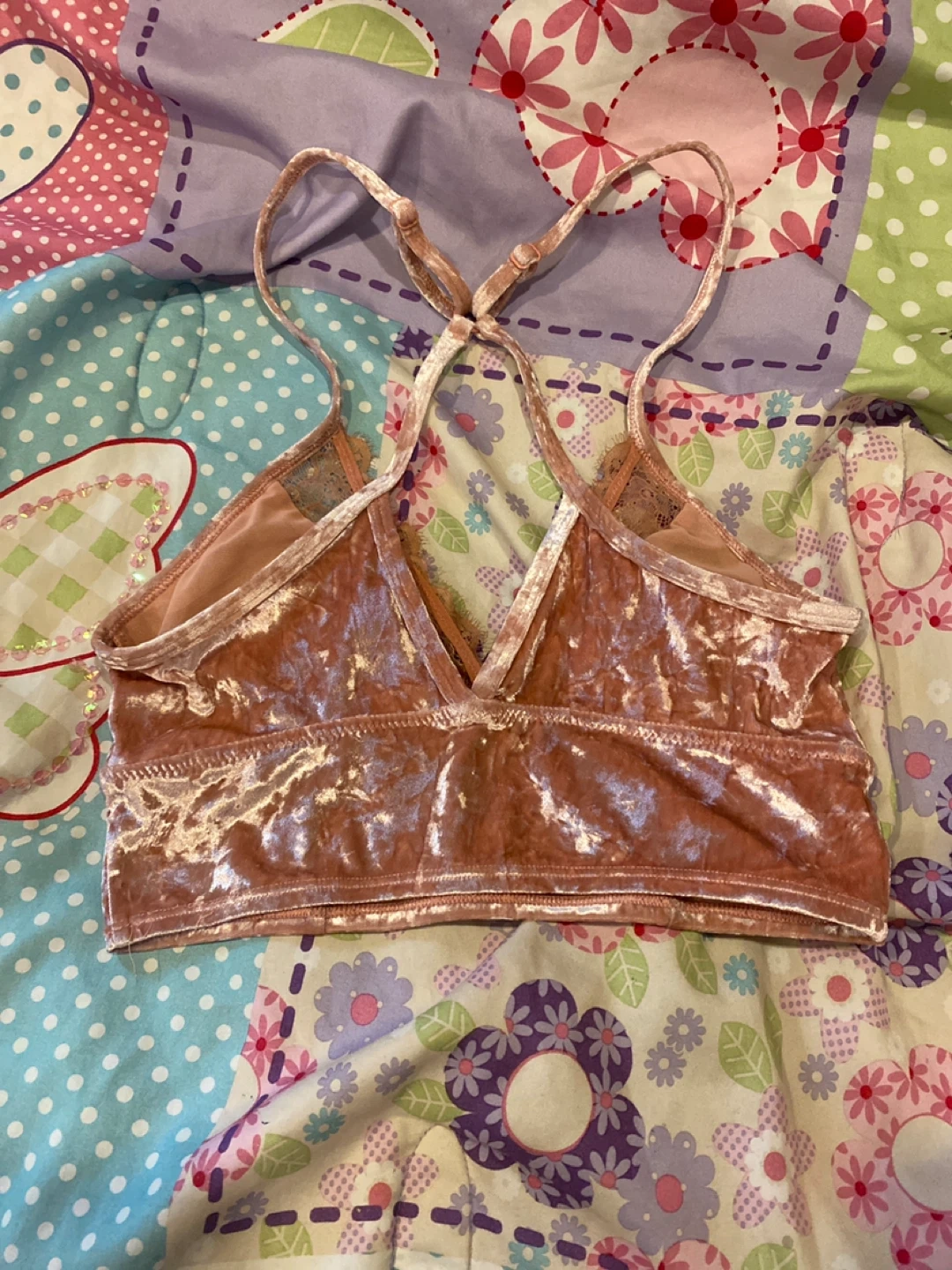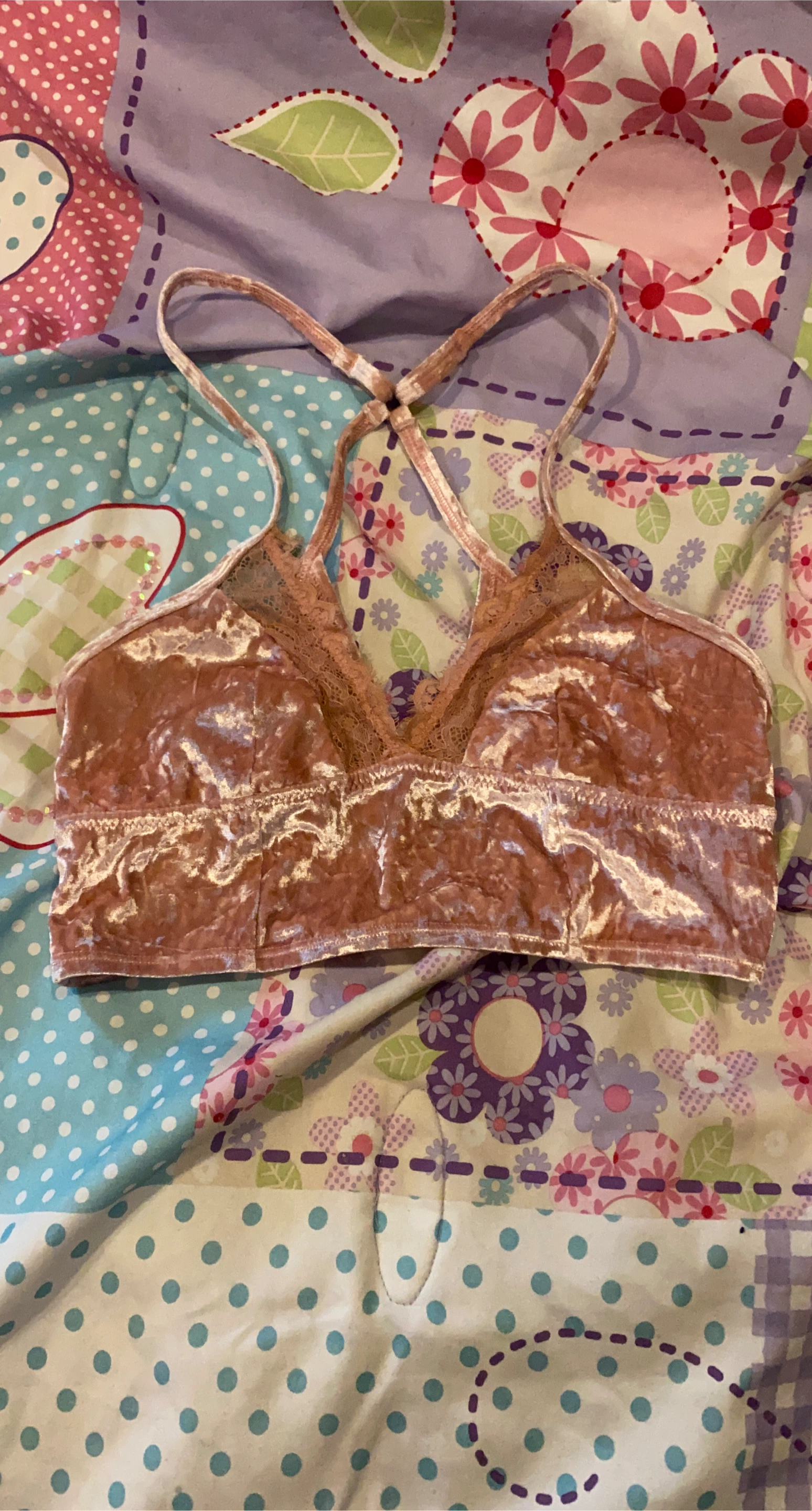 A cute pink velvet bralette! It has a strappy back and lace trim. Perfect for layering or wearing on its own