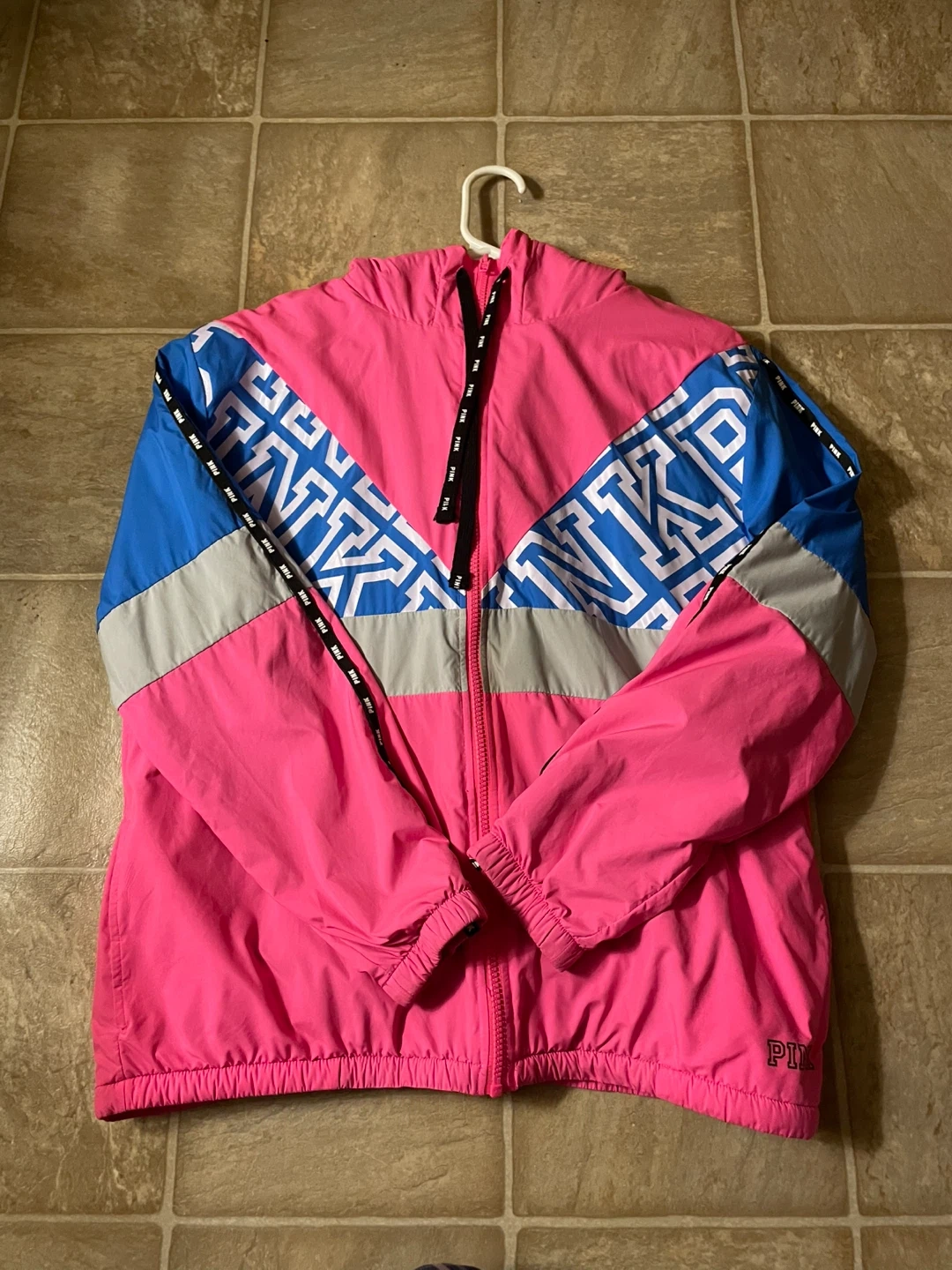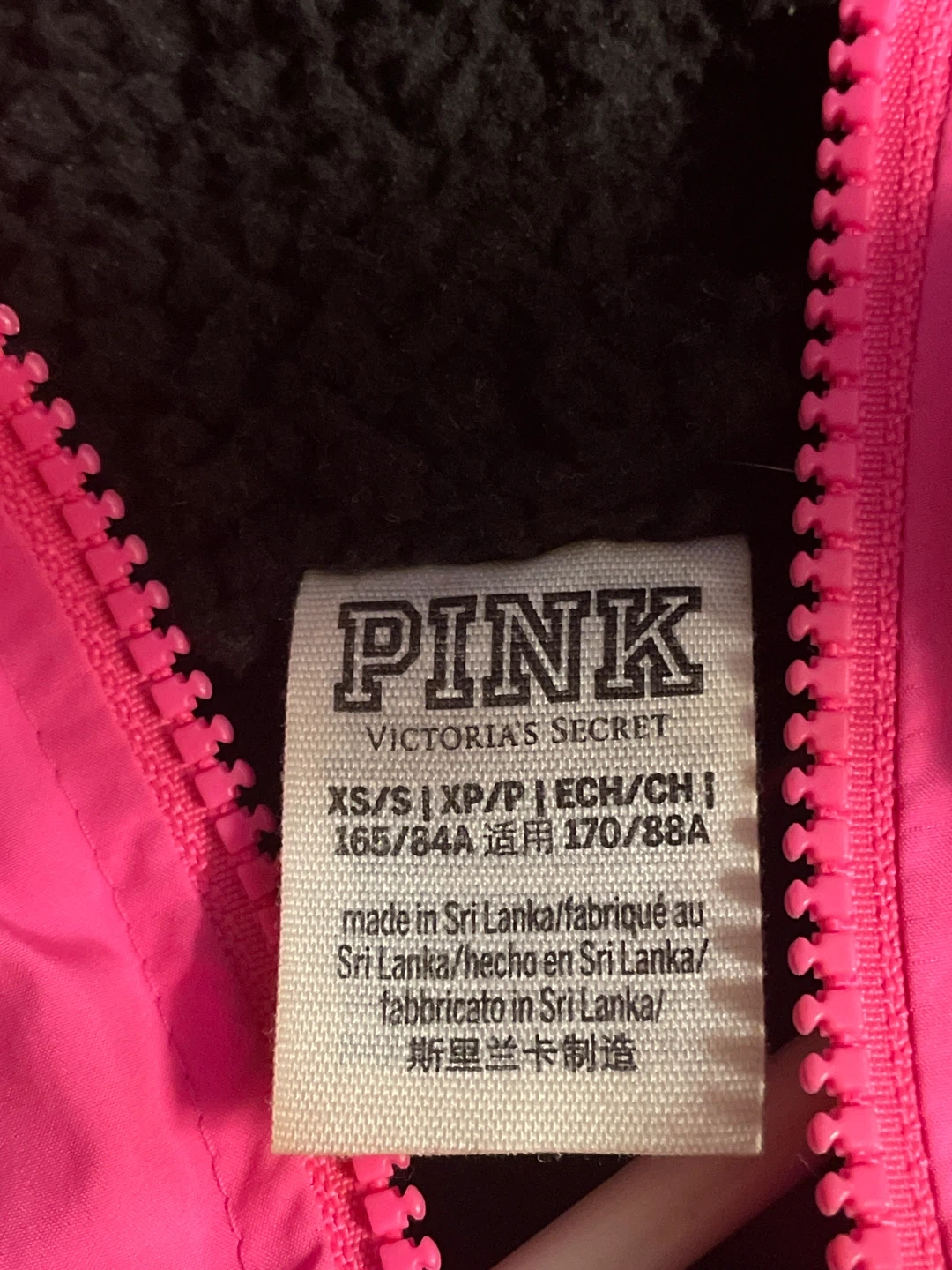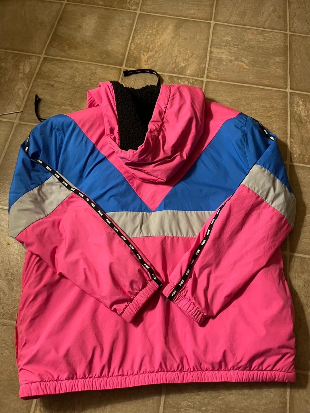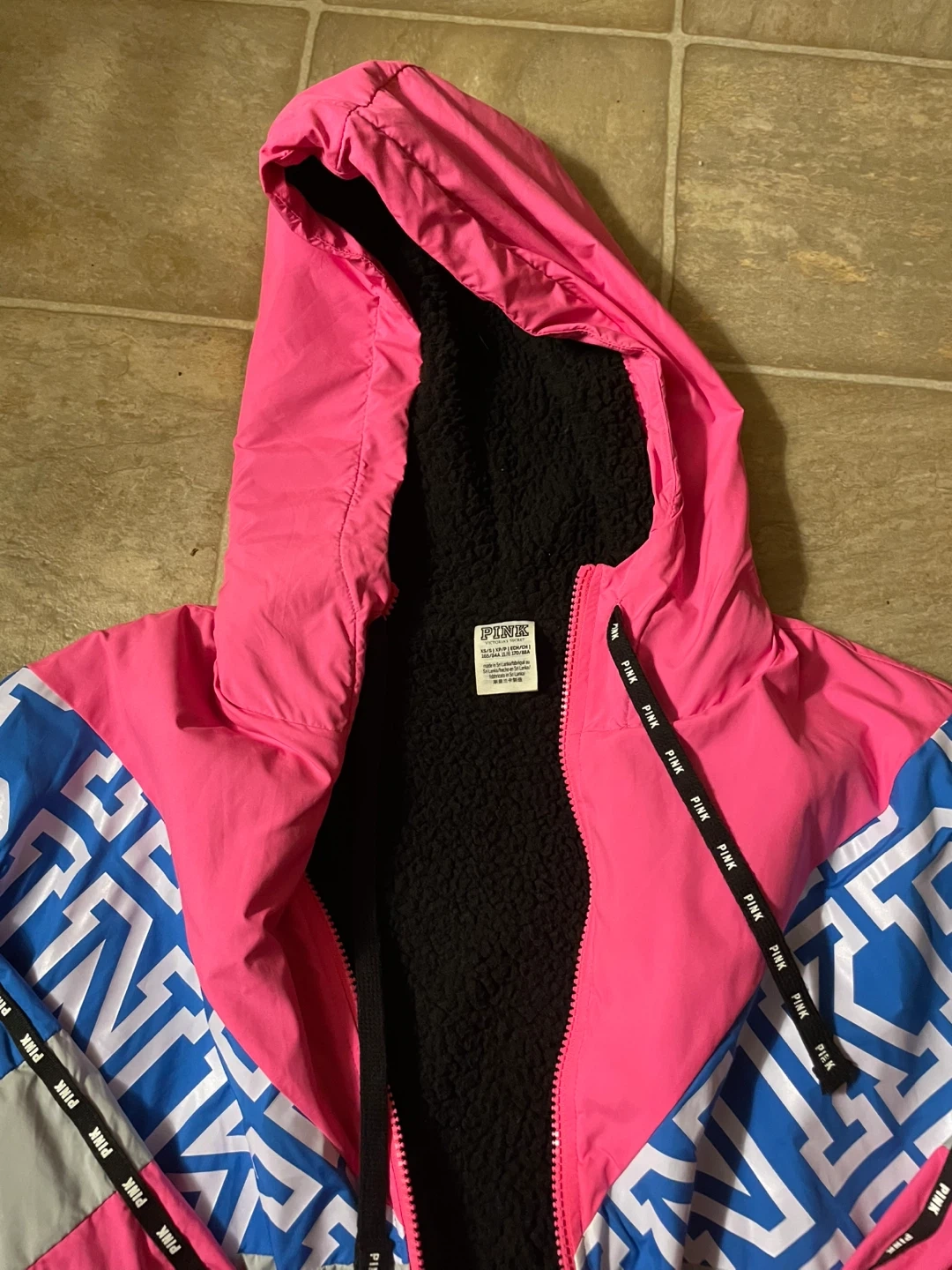 10Selling a PINK Victoria's Secret jacket in size XS/S. Hot pink with blue and grey. black sherpa material inside with a hood. Great condition zipper works great
