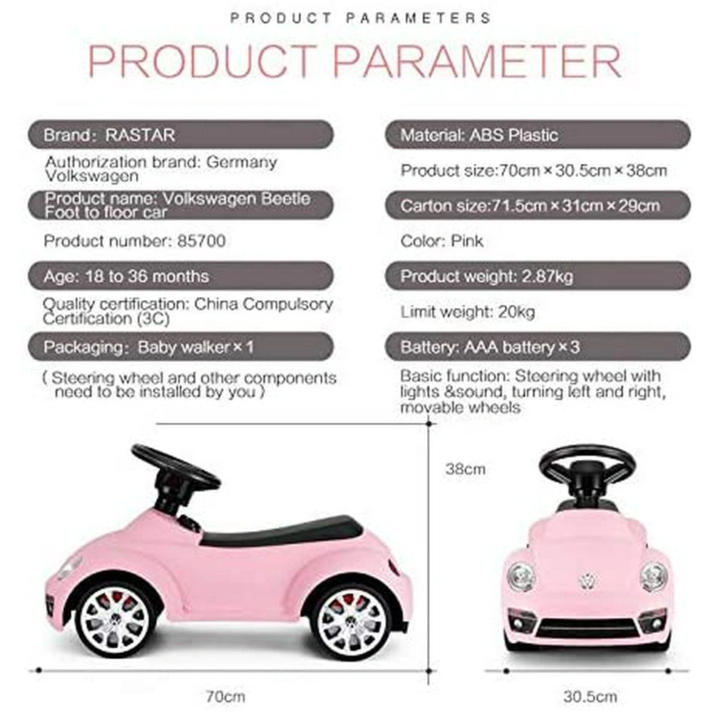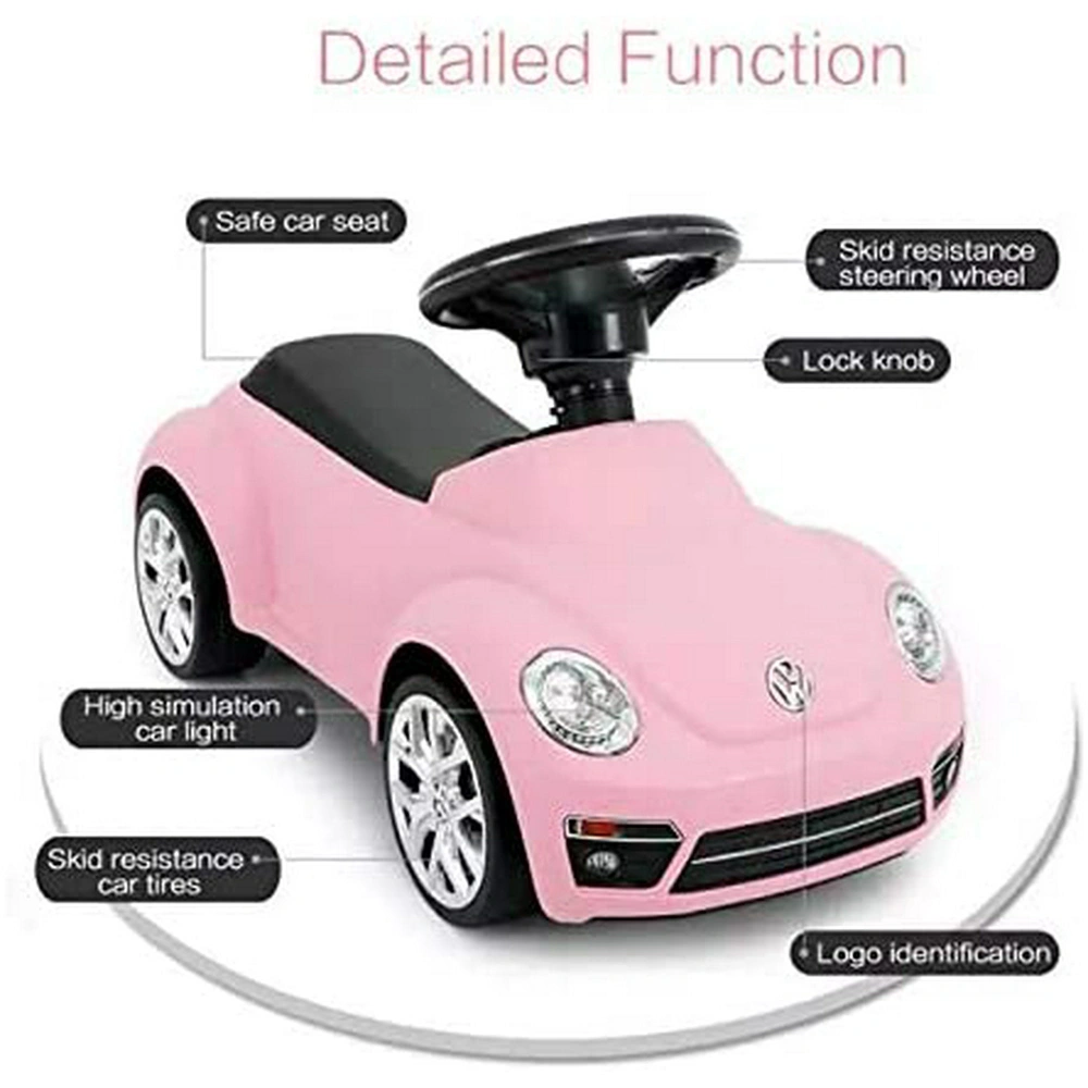 94Voltz Toys Licensed Beetle Kids Foot to Floor Push Along Ride-on Car (Pink) This wonderful Beetles Pink foot-to-floor car will give your little one hours of fun drive The steeling wheeling and horn will give kids a fantastic driving experience Anti Slippery type Protect them from speedy They will absolutely love it and share it with little friends! Features and Specifications Mute Products Dimension: 70x30.5x38 cm