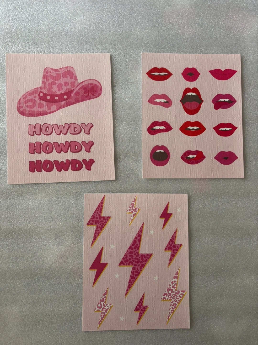 286Selling a set of three cute pink wall art prints! They feature fun designs like a cowboy hat, lips, and lightning bolts. Perfect for adding a pop of colour and personality to any room