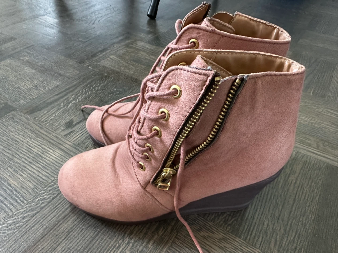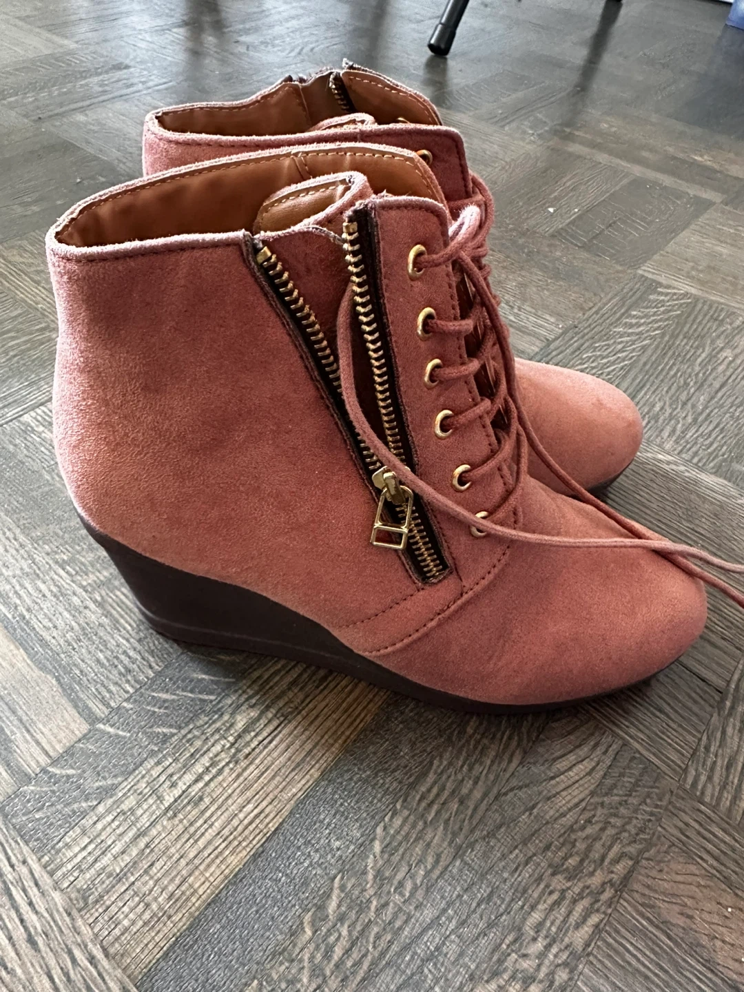 Selling a pair of cute pink wedge heel ankle boots. They feature a side zipper and lace-up front. Perfect for adding a bit of height and style to your outfit! Not much used Size 36 Pick up- Near Fairview mall, North York