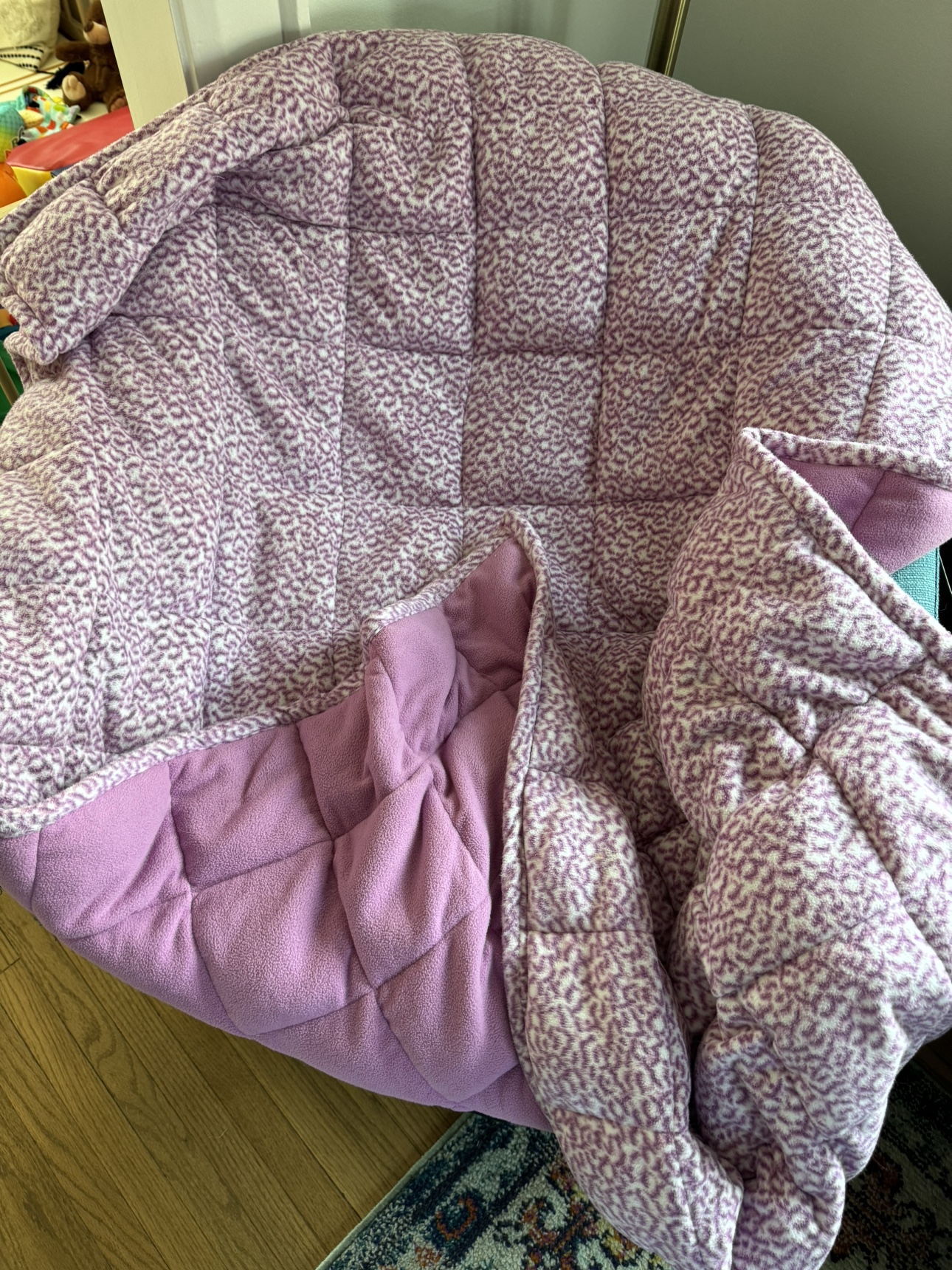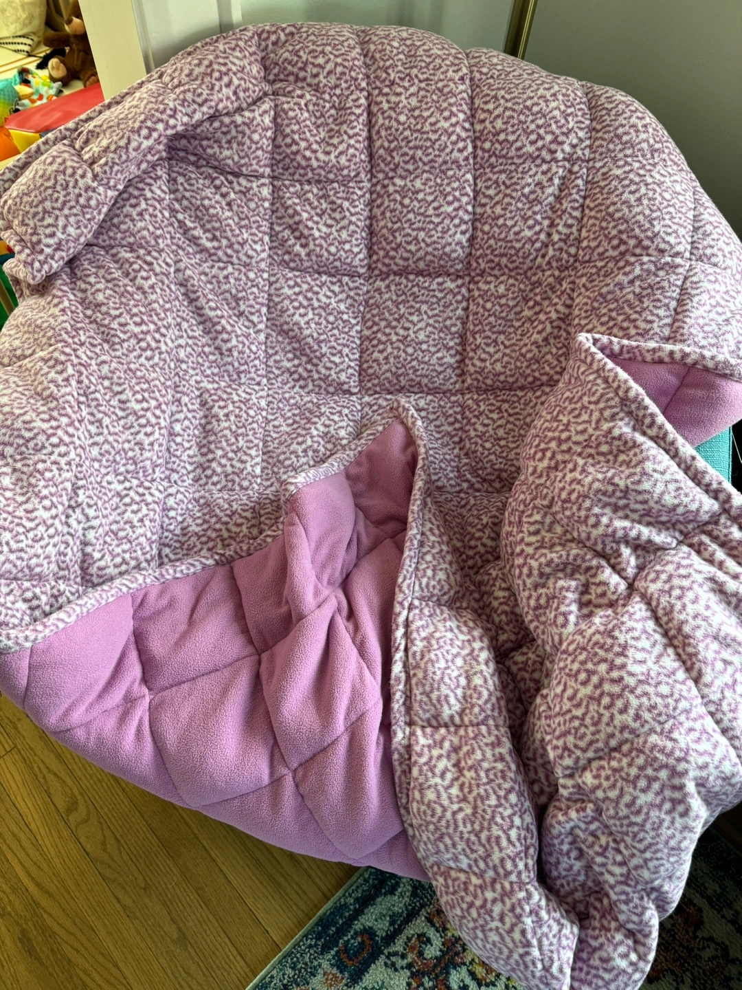 27A soft and comfortable fleece weighted blanket with a pink pattern. It is perfect for cuddling up on the couch or in bed.