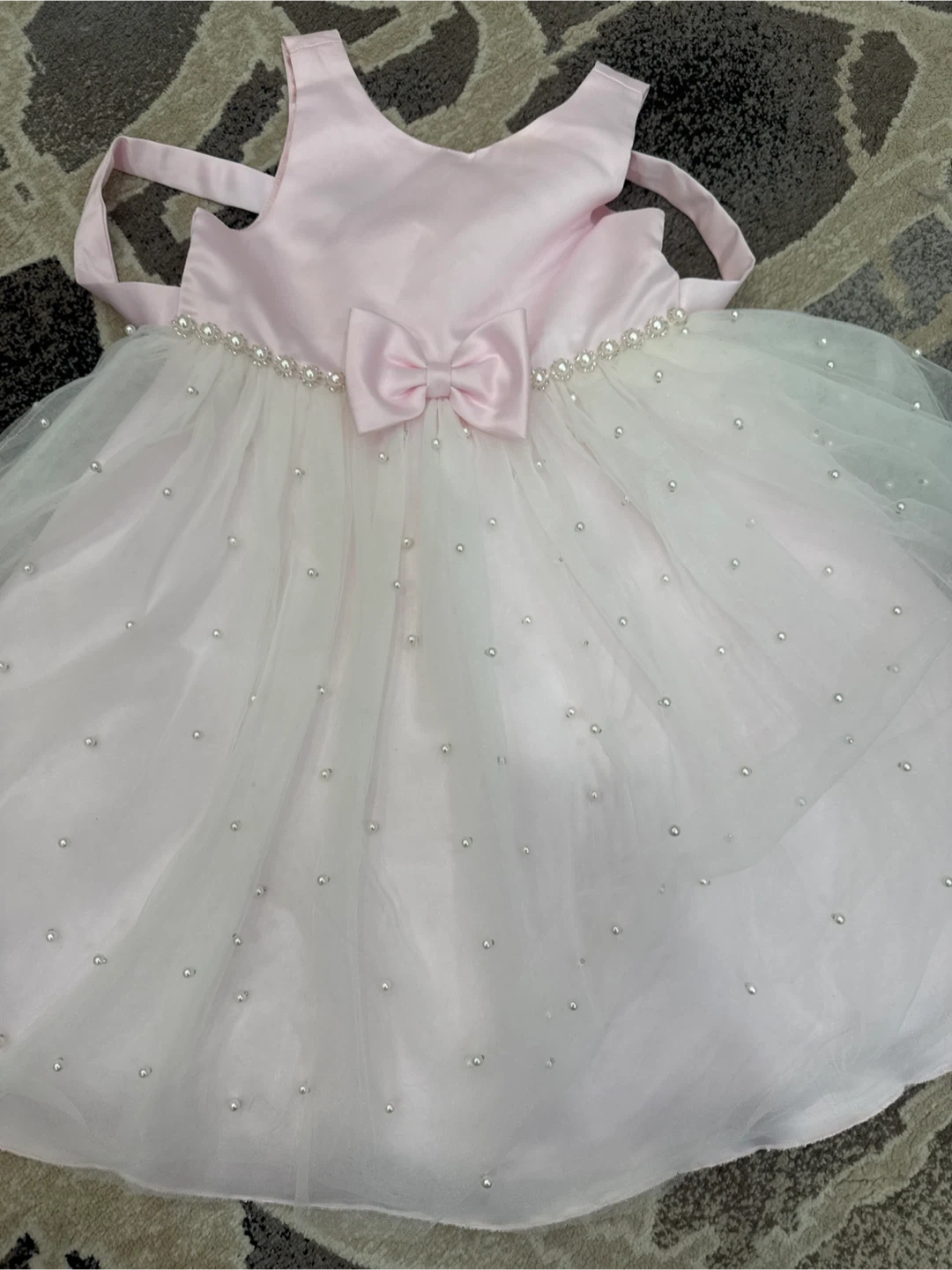 5This adorable dress is perfect for a special occasion! It features a lovely pink bodice with a bow and a white tulle skirt adorned with pearls. It's in great condition and ready for a new home
