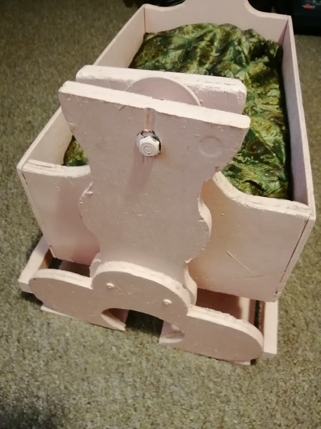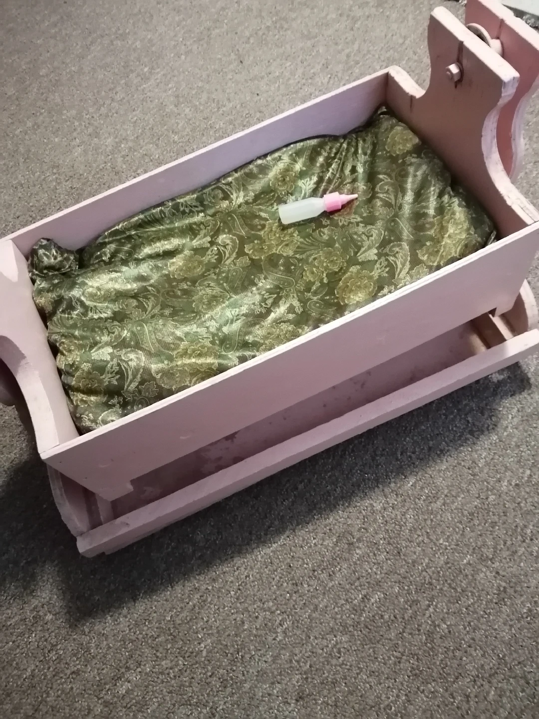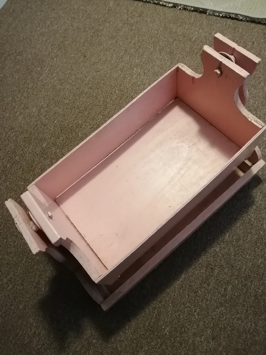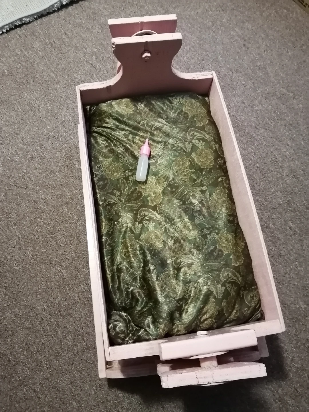Selling a handmade cute pink wooden cradle. It comes with a green patterned cushion and a small bottle. Perfect for a toy nursery or as a decorative piece!