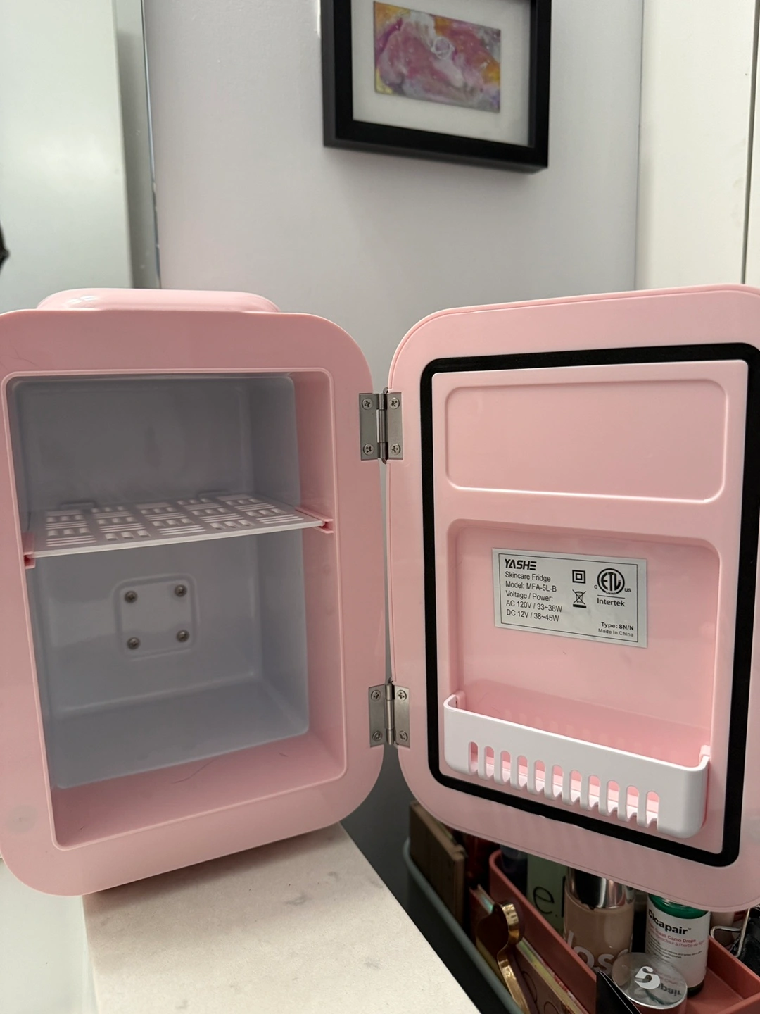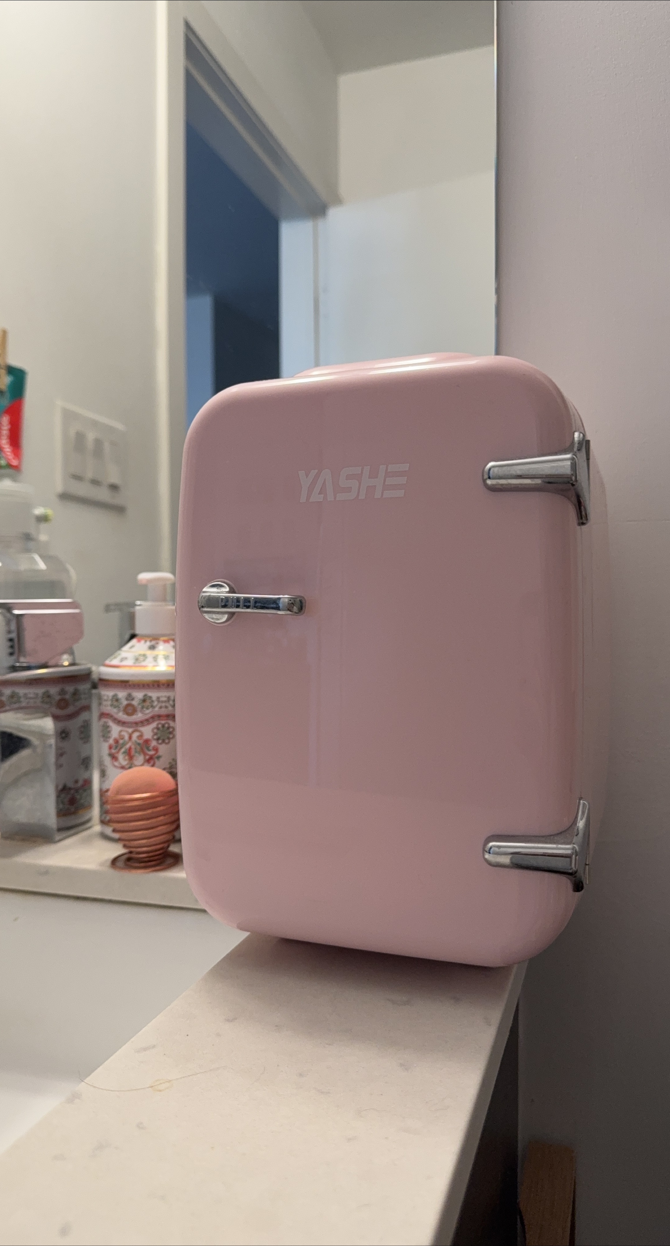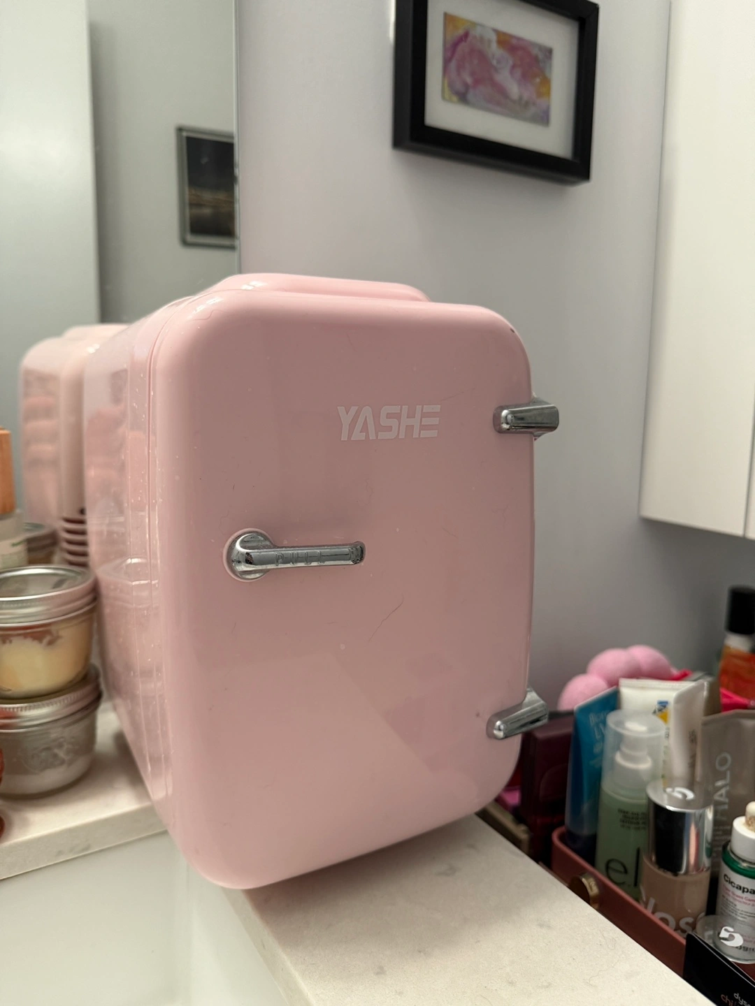 27A cute pink Yashe skincare fridge, perfect for keeping your beauty products cool and fresh! Comes with both AC and DC power cords. Great for home or on the go! Barely used, in perfect condition. Size: 4L/6 cans
