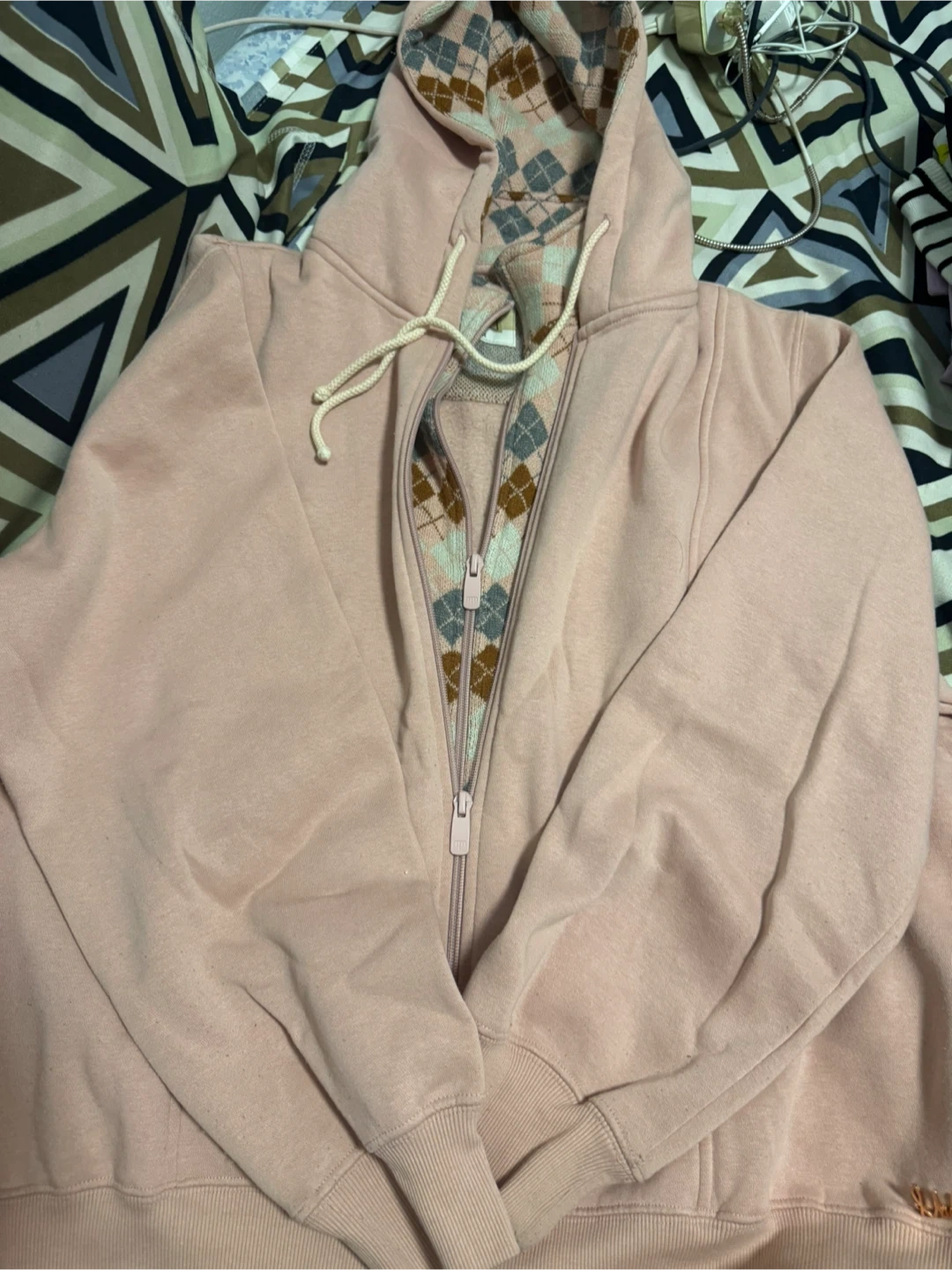 Selling a cute pink zip-up hoodie! It has a unique argyle pattern on the inside of the hood and along the zipper. It's in great condition and ready for a new home