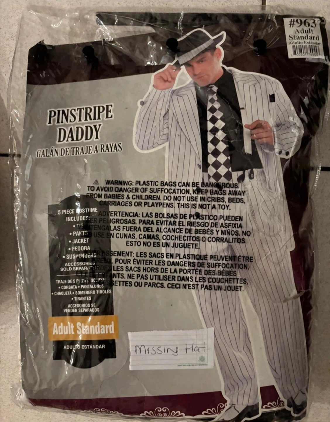 Selling a Pinstripe Daddy adult costume. It includes the pants, jacket, tie, and suspenders. Please note that the fedora/hat is missing. Size is Adult Standard.