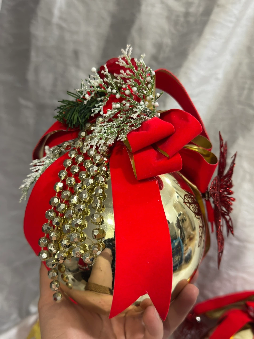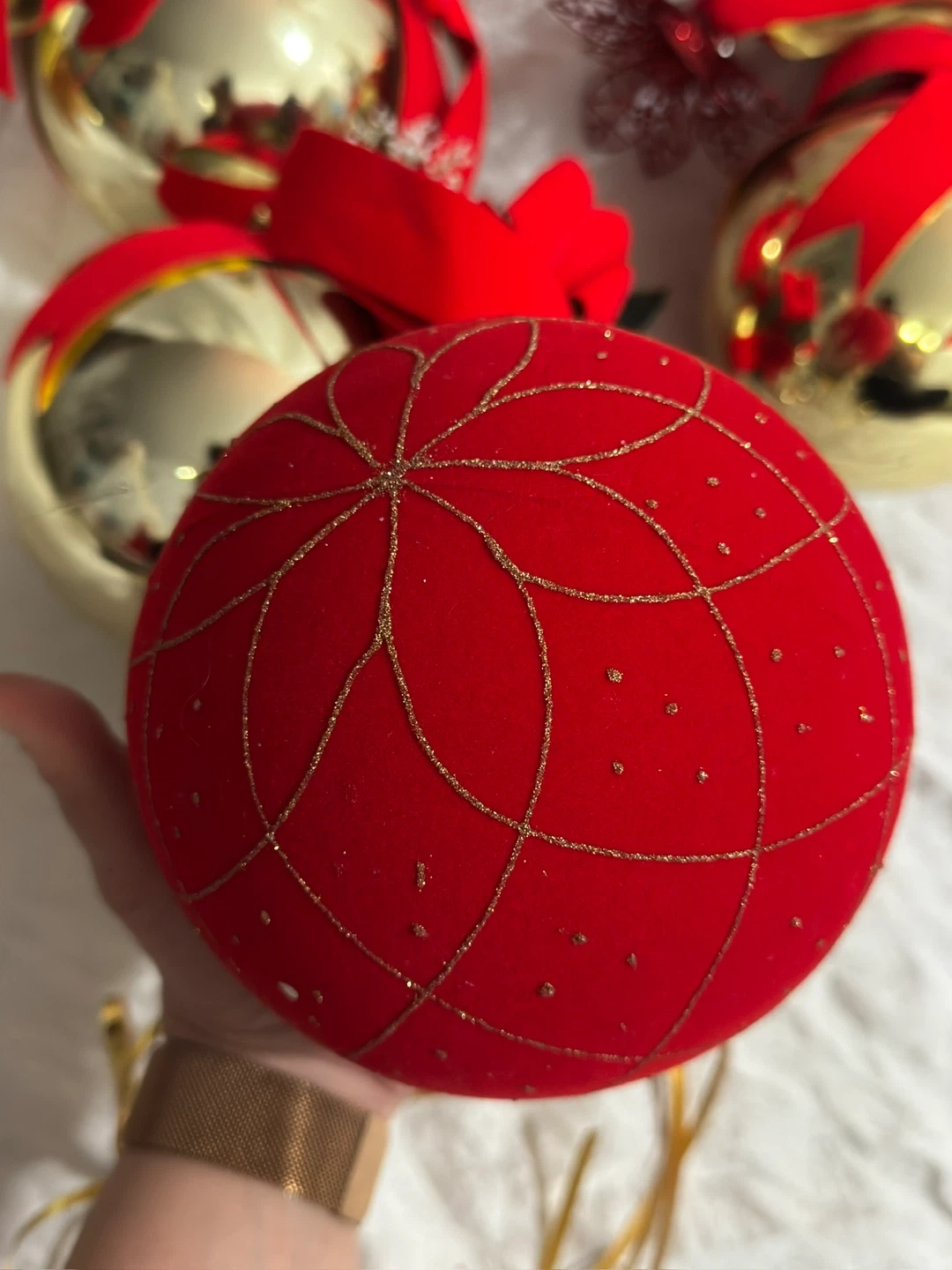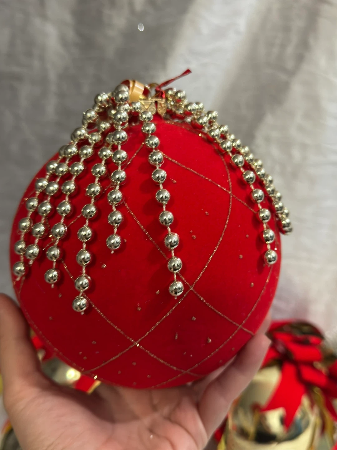 This festive red Christmas ornament features a velvet-like texture with a delicate gold-patterned overlay and beaded accents. It's part of a collection of holiday decorations. It's sure to add a touch of elegance to your tree!