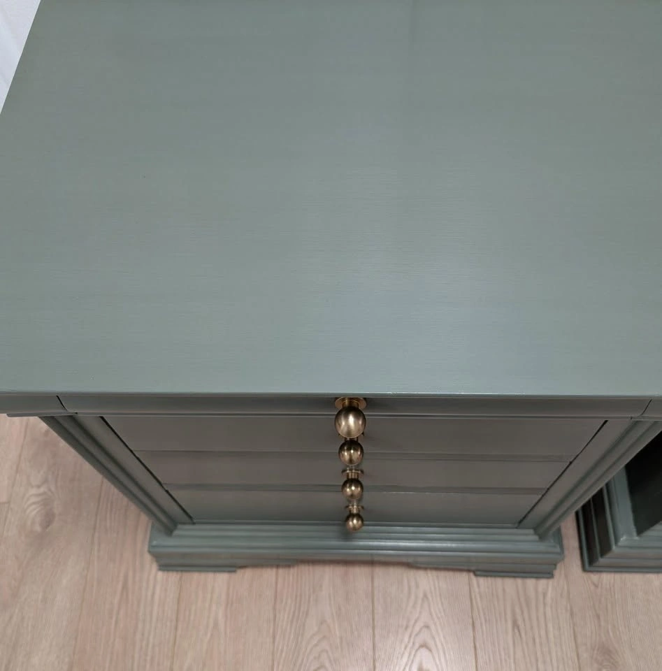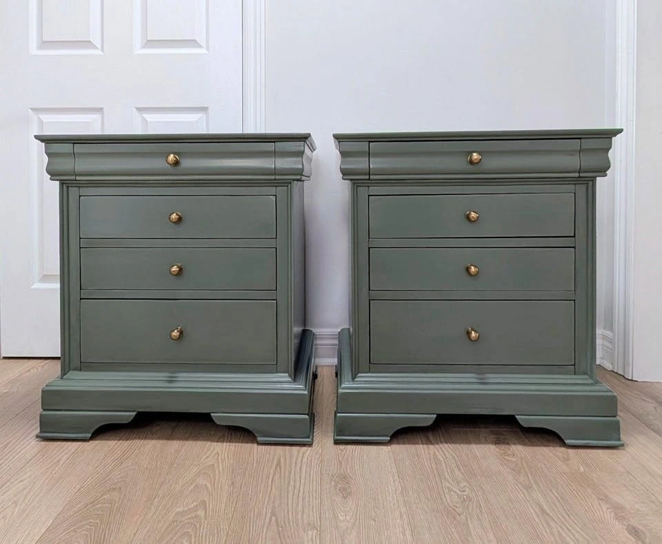 Beautiful oversized wood nightstands professionally refinished in Fusion Minerals 'Carriage House'. Each has four easy-gliding drawers, lined top drawers, and new modern hardware. Finished with an ebony glaze and varathane for dimension and durability.