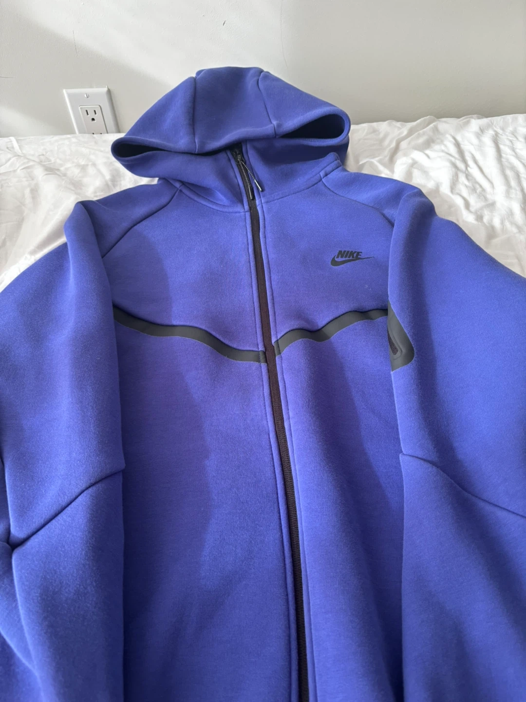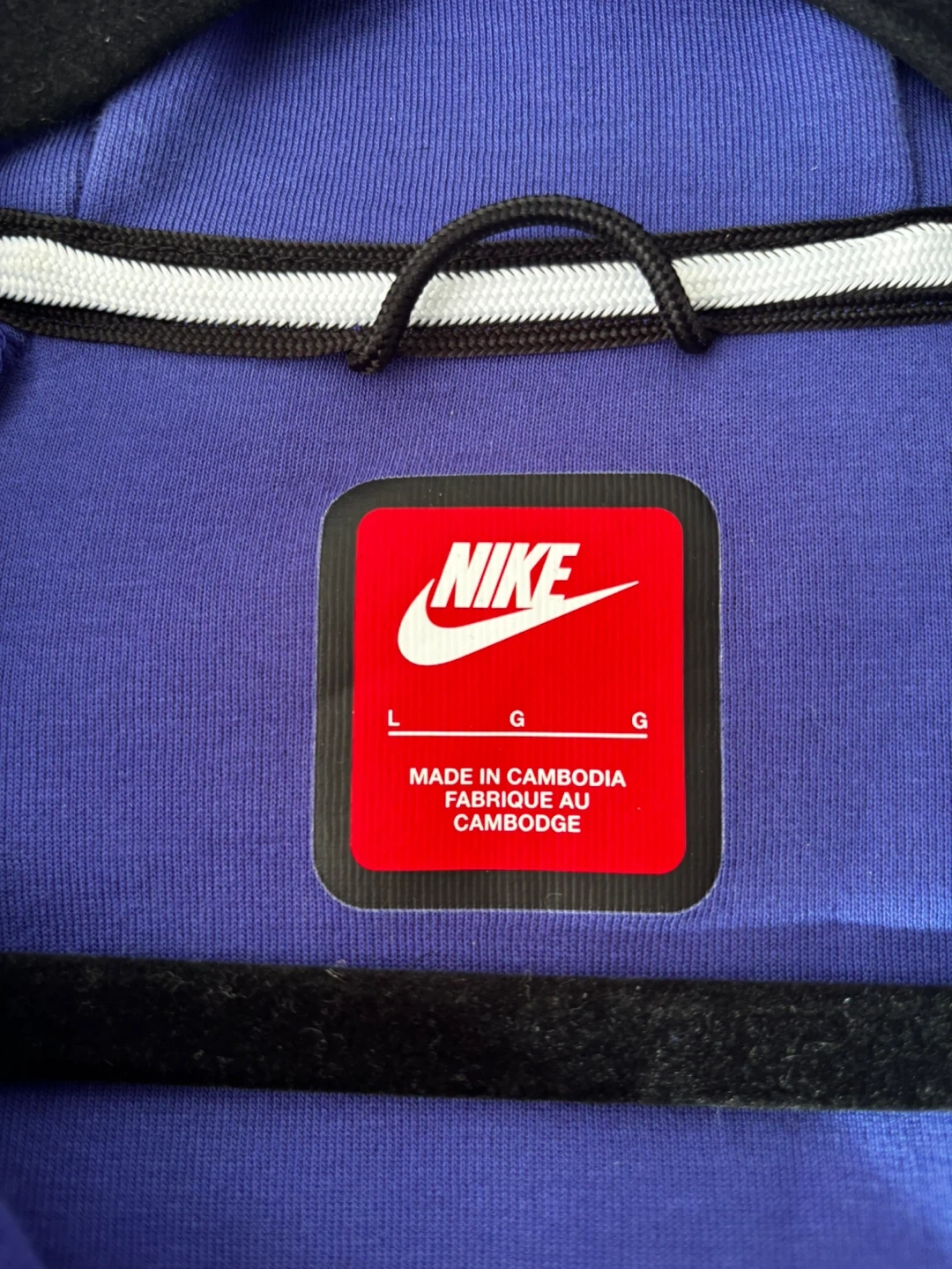 Selling a Nike Tech Fleece hoodie in size large. It's in great condition and ready for a new owner. The hoodie features the iconic Nike swoosh and is made in Cambodia.