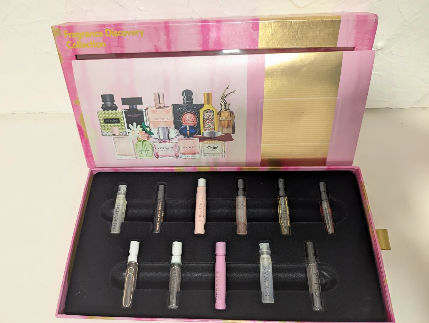 This Fragrance Discovery Collection features a variety of perfume samples including Valentino, Narciso Rodriguez, Givenchy, Versace, My Way, Chloe, and Burberry. It's a great way to try different scents. Includes 11 vials.
