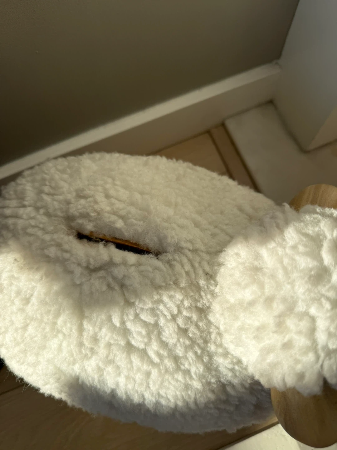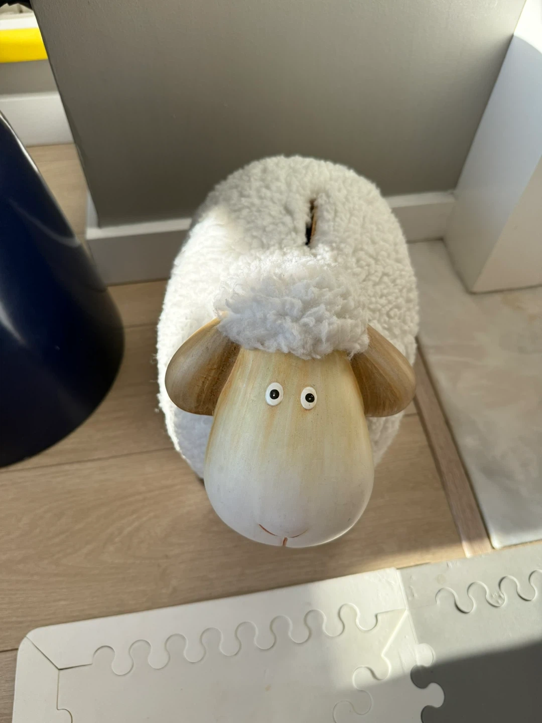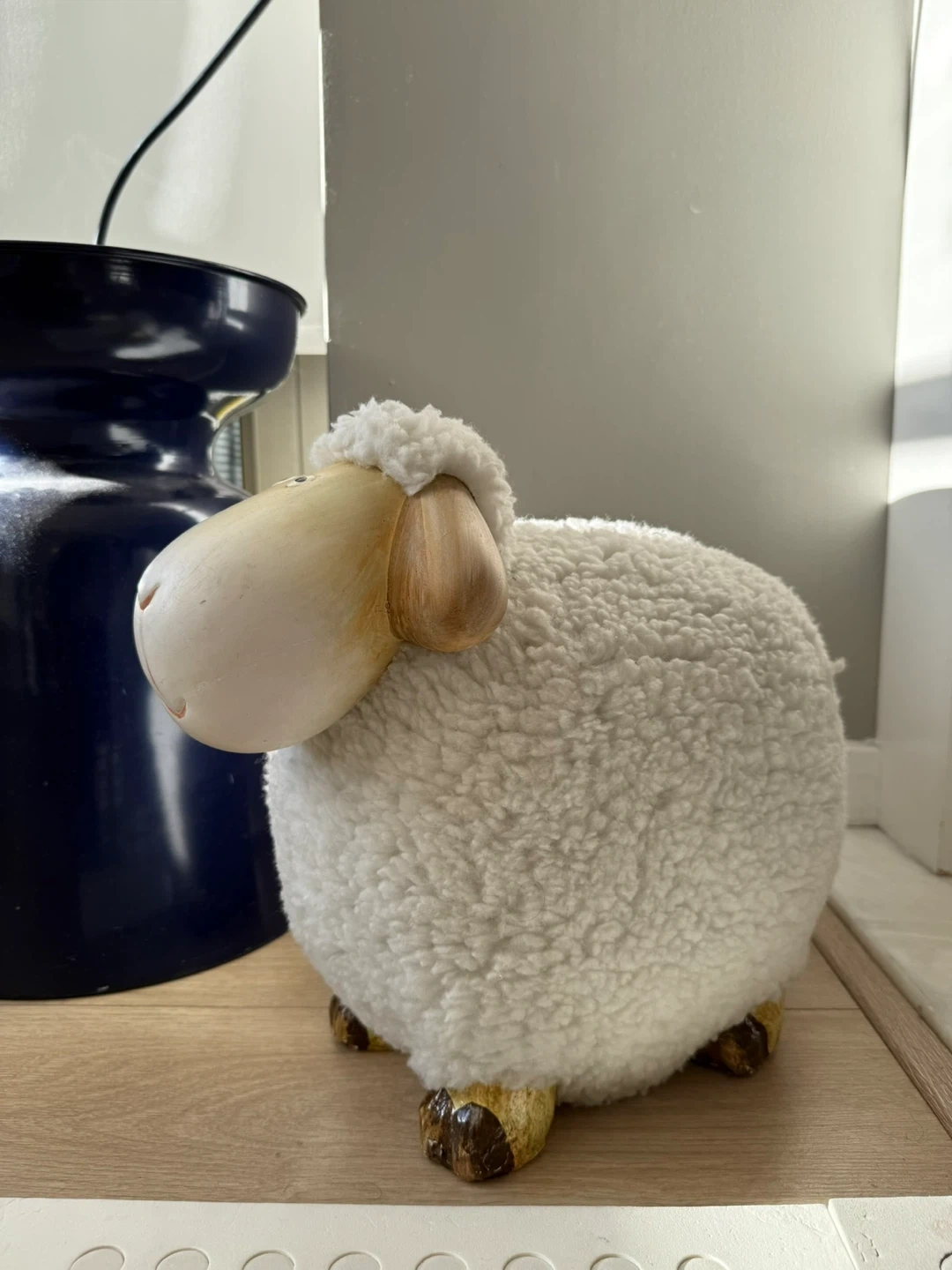 Large This is a cute, fluffy white sheep coin bank. It's perfect for saving up spare change! The sheep has a fuzzy texture and wooden accents on its face and feet.