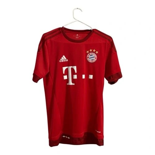 This is a 2015-16 FC Bayern Munich Home Jersey, a classic Adidas football shirt. It features a clean red design with claret accents and was worn during a dominant season where Bayern Munich won the Bundesliga and DFB-Pokal. The shirt is predominantly "true red" with "craft red" details on the cuffs and hem, featuring a ribbed crewneck and the iconic Adidas three stripes on the shoulders. It utilizes Climacool ventilation technology with mesh inserts to keep you cool and dry. Includes the embroidered FC Bayern Munich badge on the chest. Size: Small Men’s. Pit to pit: 17.5”, Length: 26”.