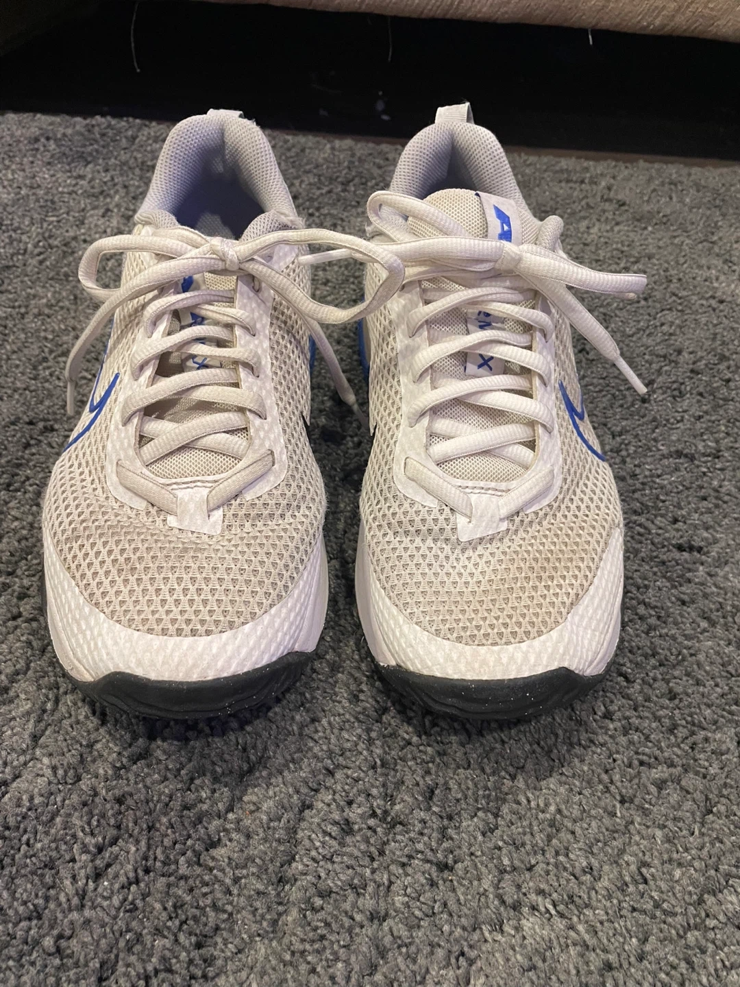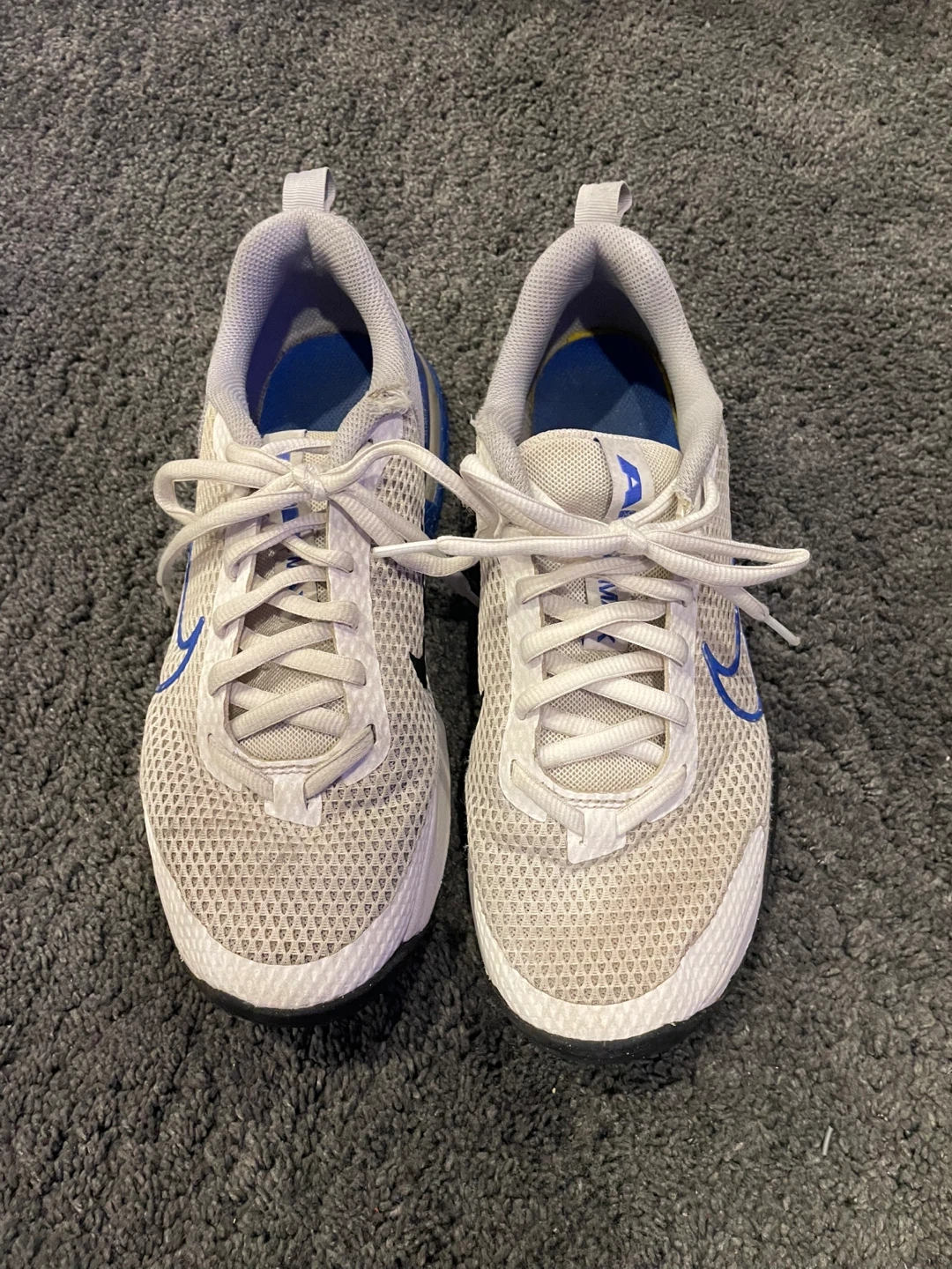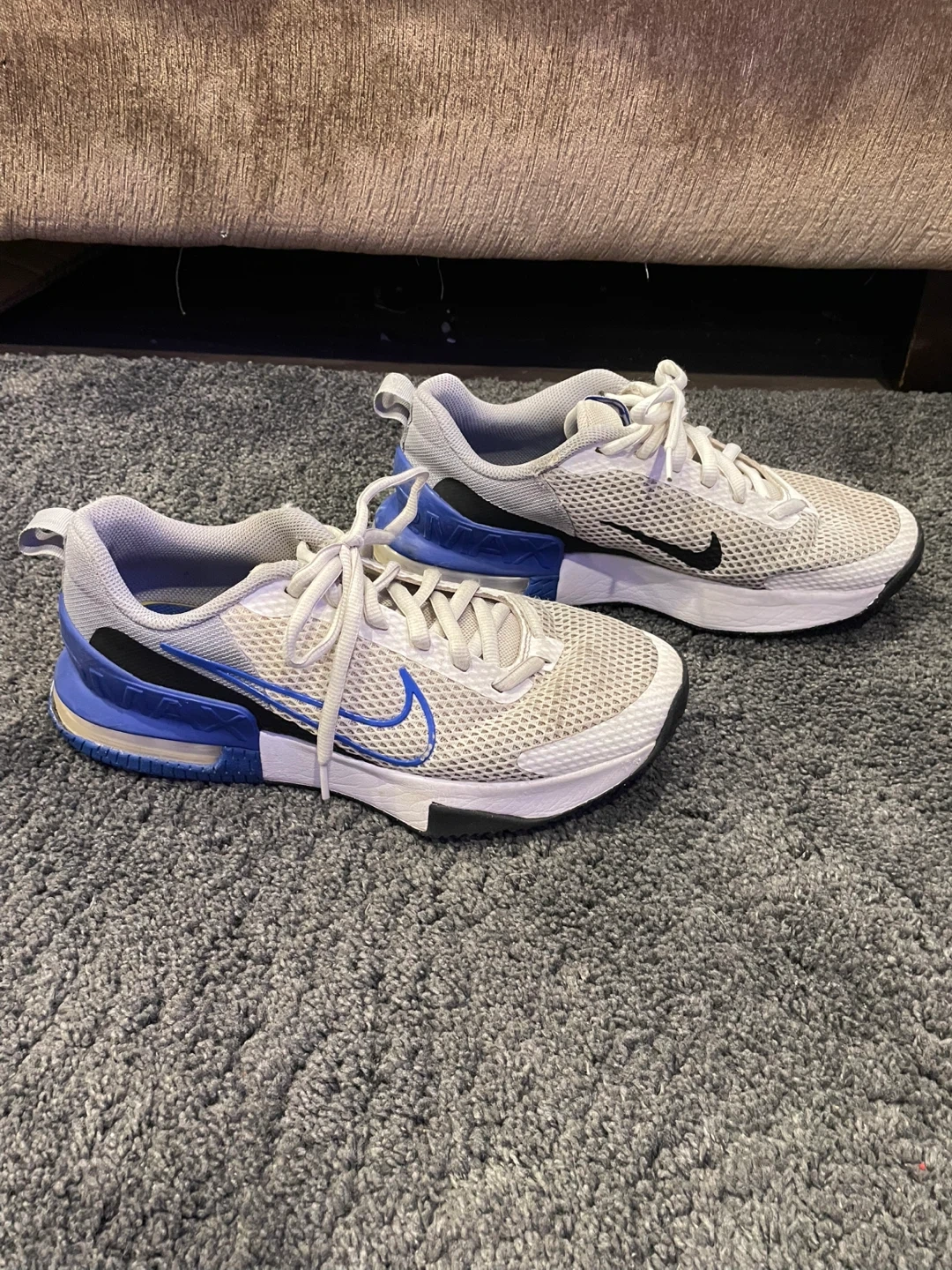 These are Nike Air Max sneakers. They're white and blue with a mesh upper. Size 9 US.