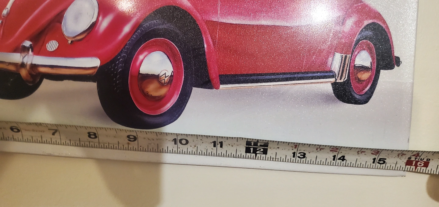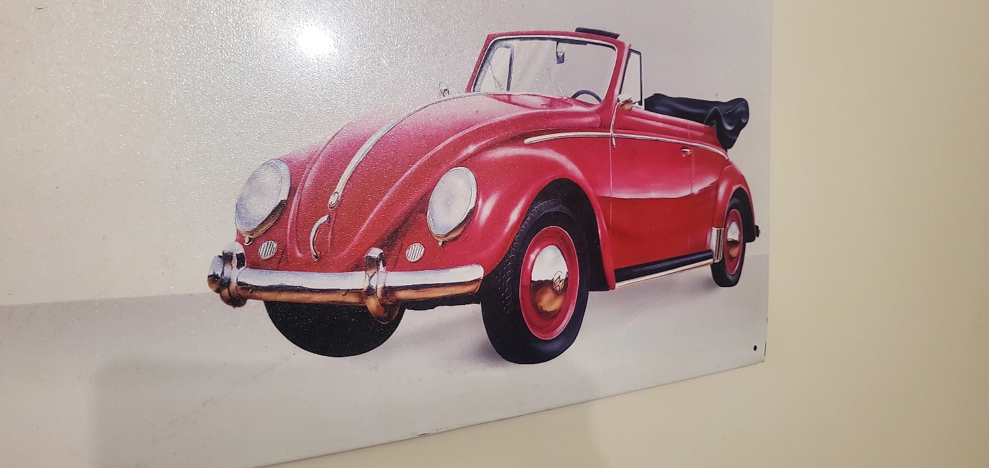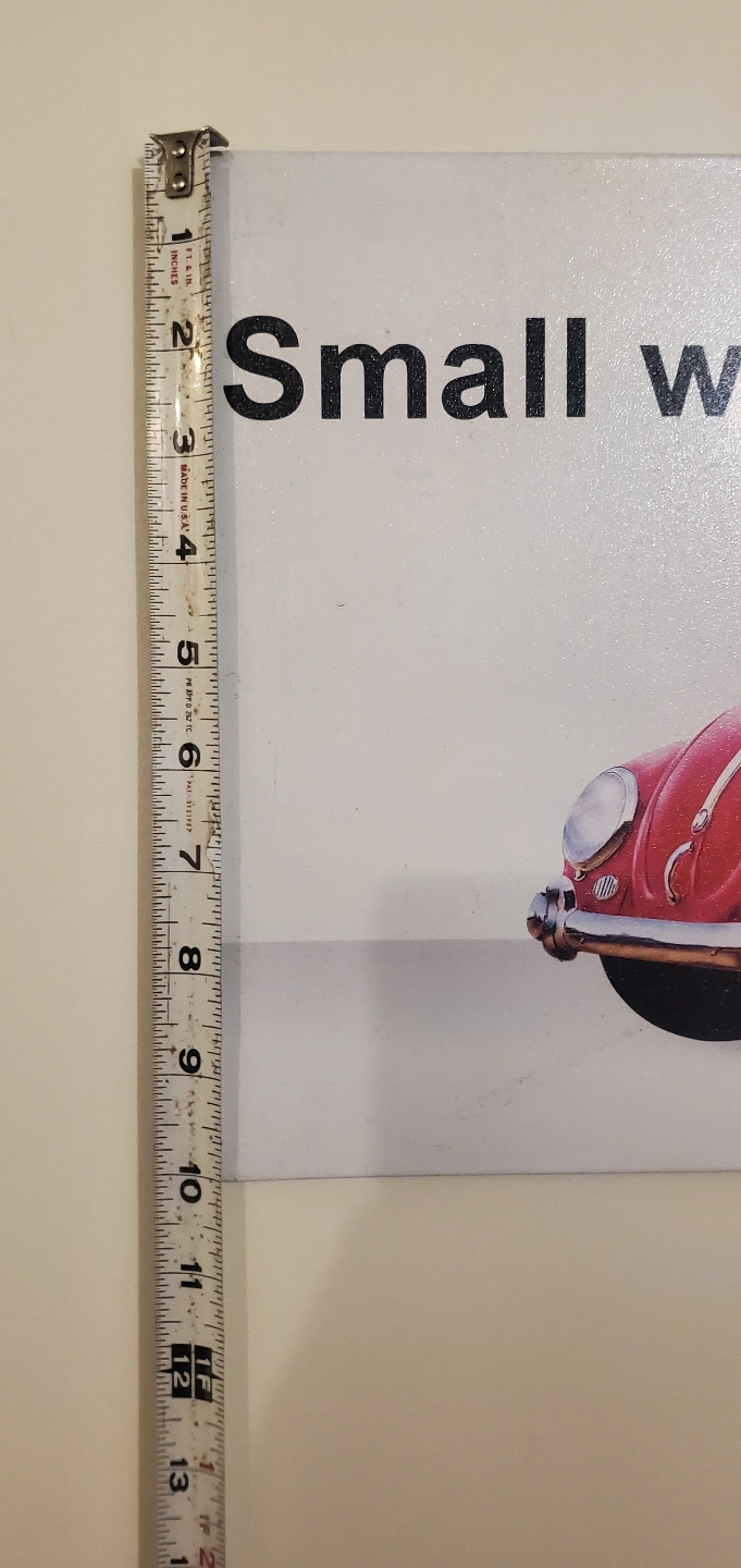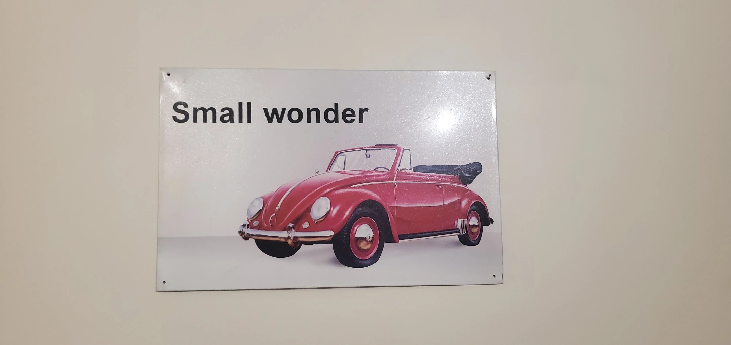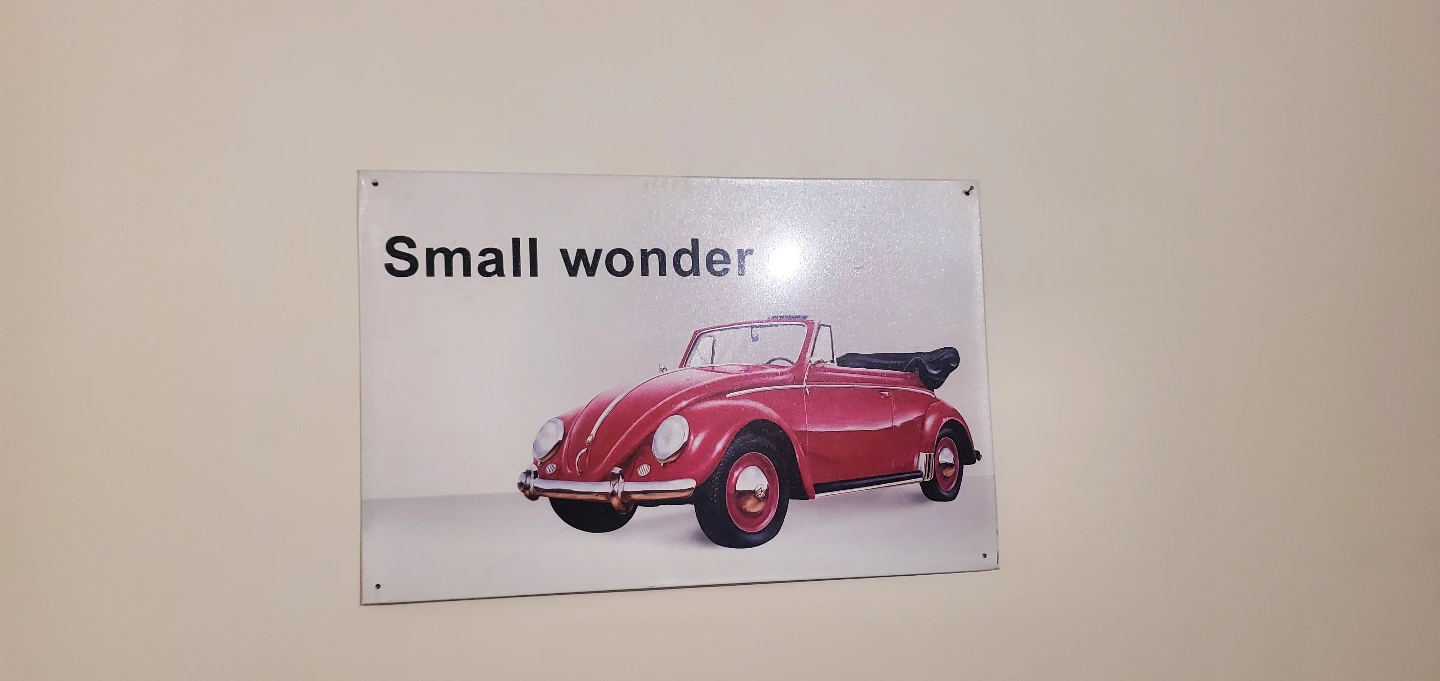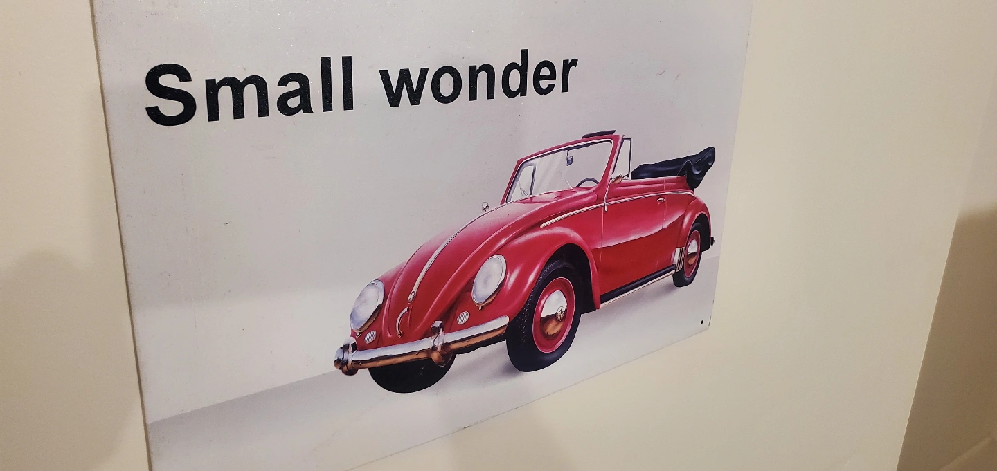 Metal wall sign featuring a red Volkswagen Beetle convertible. Says "Small wonder" at the top. Measures approximately 14" x 10"