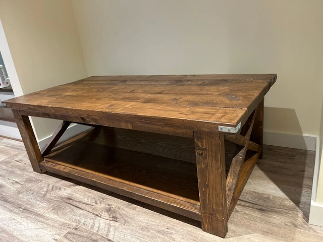 This handmade wood coffee table brings a touch of rustic charm with its sturdy construction and warm finish, perfect for anchoring your living space. As a previously loved piece, it shows some character but remains a functional and stylish addition to your home decor. Additional features include: Solid handmade wood construction, Lower shelf for storage or display, Classic design. This table has seen a few stories, and it's ready to be a part of yours. Cash accepted.