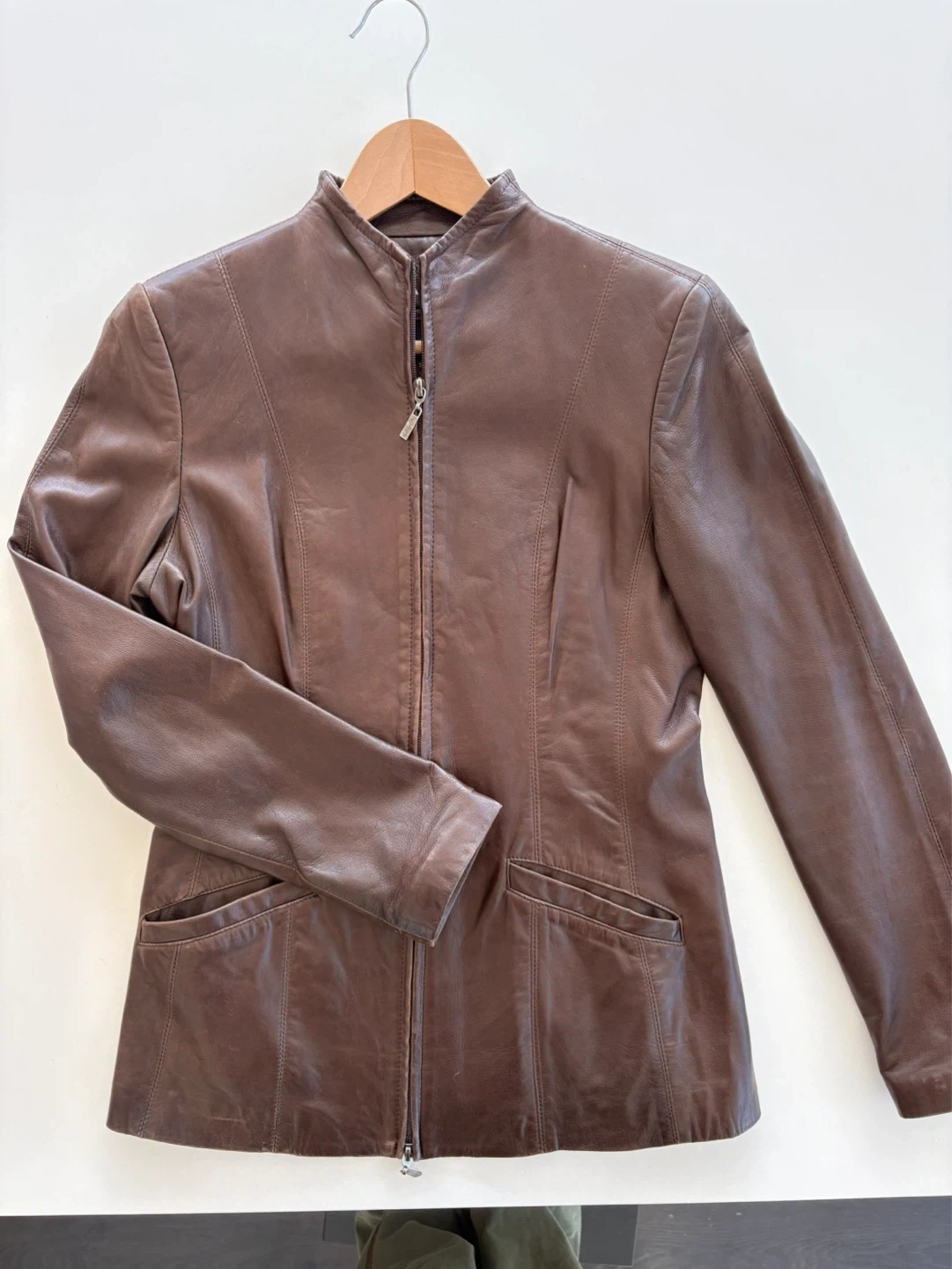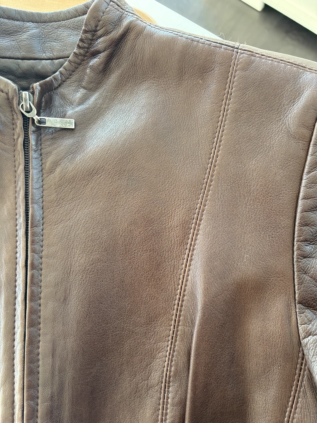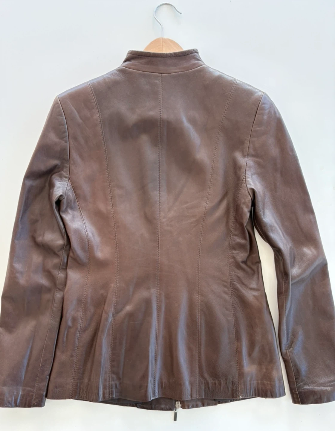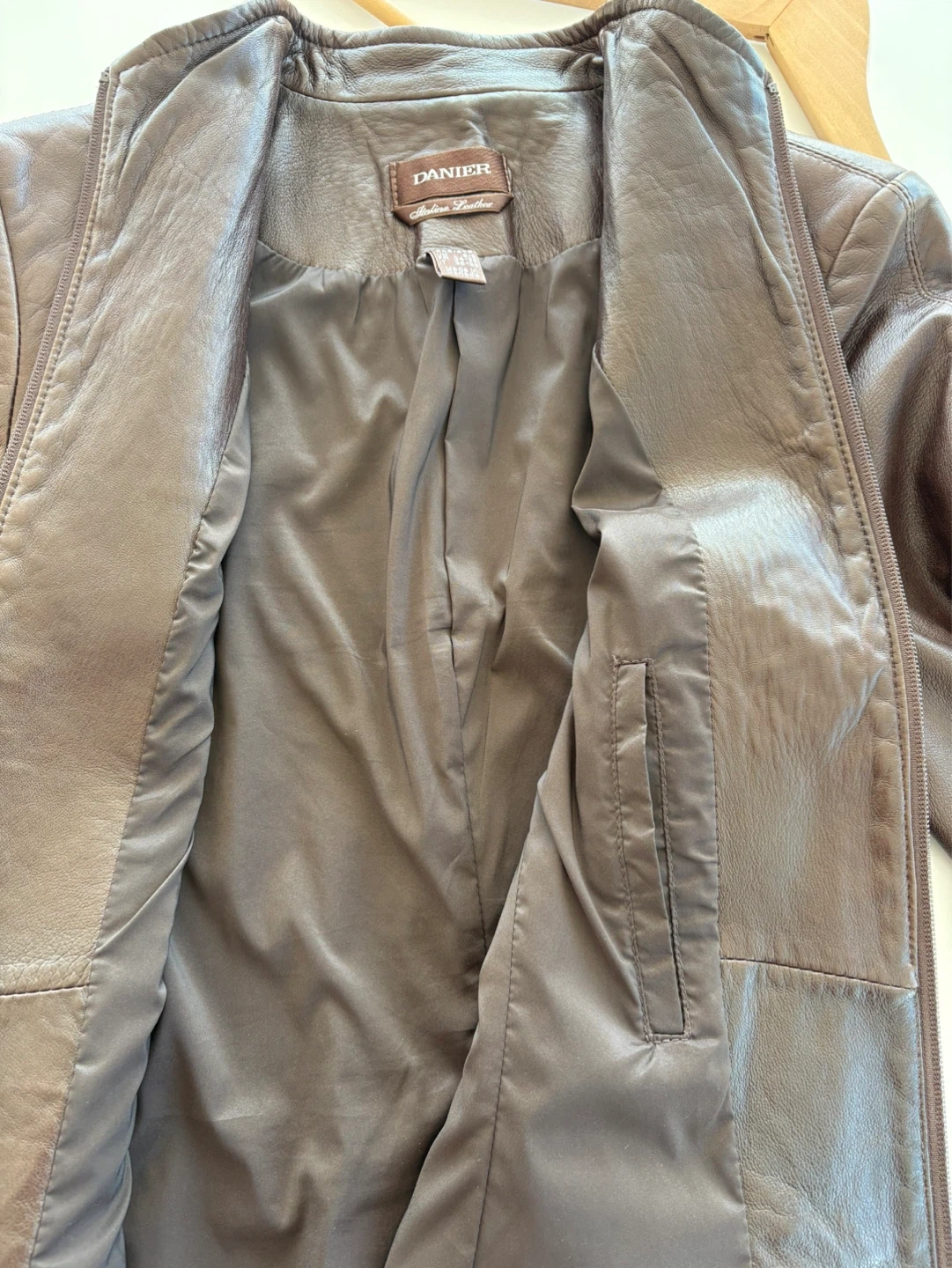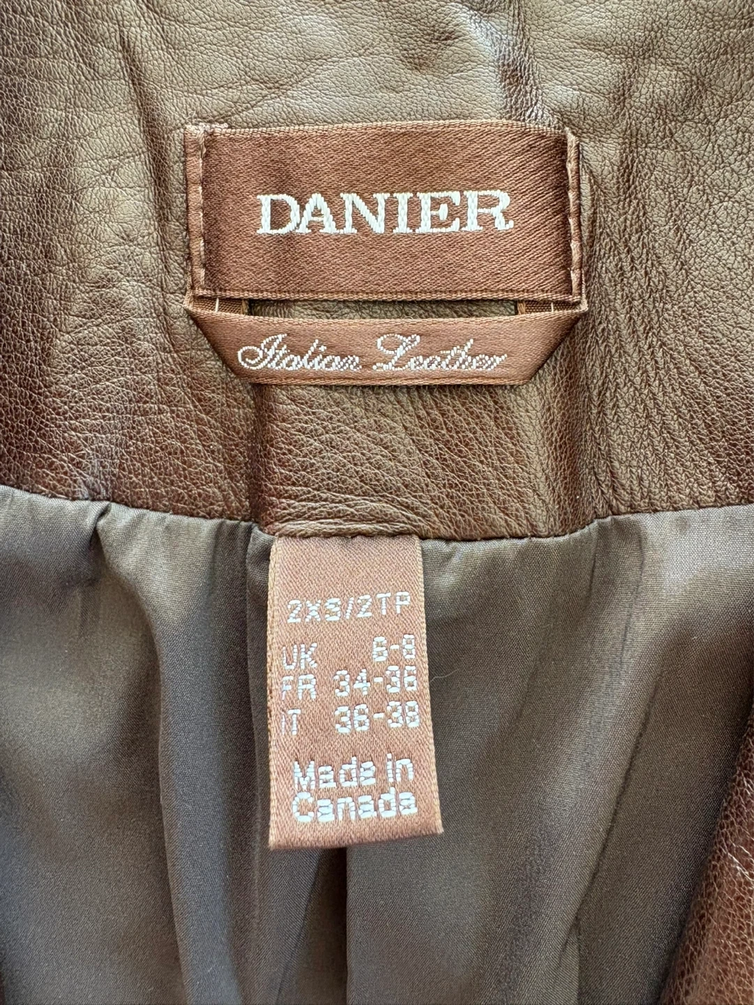 Danier jacket made in Canada from genuine Italian leather. Rich brown tone. Sleek, tailored silhouette with a minimalist zip-front design—perfect for everyday wear or dressing up. Soft, high-quality leather with a structured yet flattering fit. A timeless Canadian-made piece that will never go out of style.