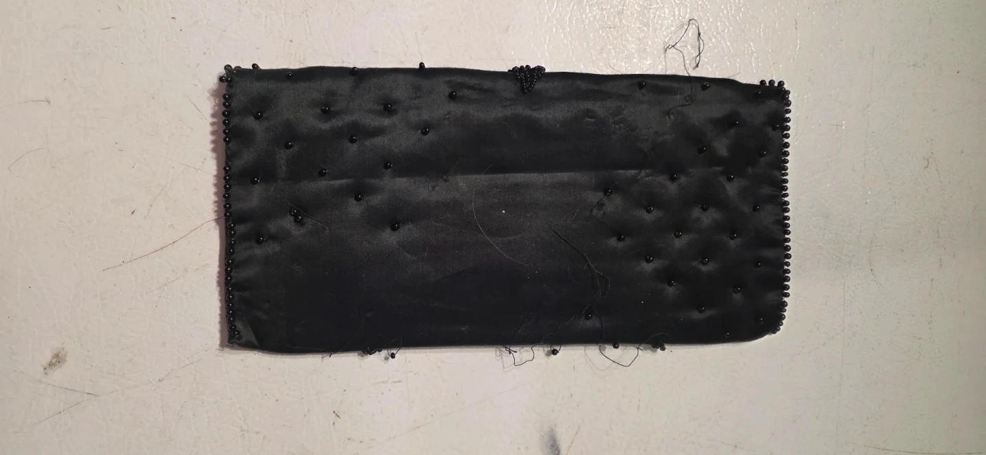This is a black satin clutch purse embellished with black beads. The beadwork forms floral patterns on the front. It's suitable for evening wear or special occasions.