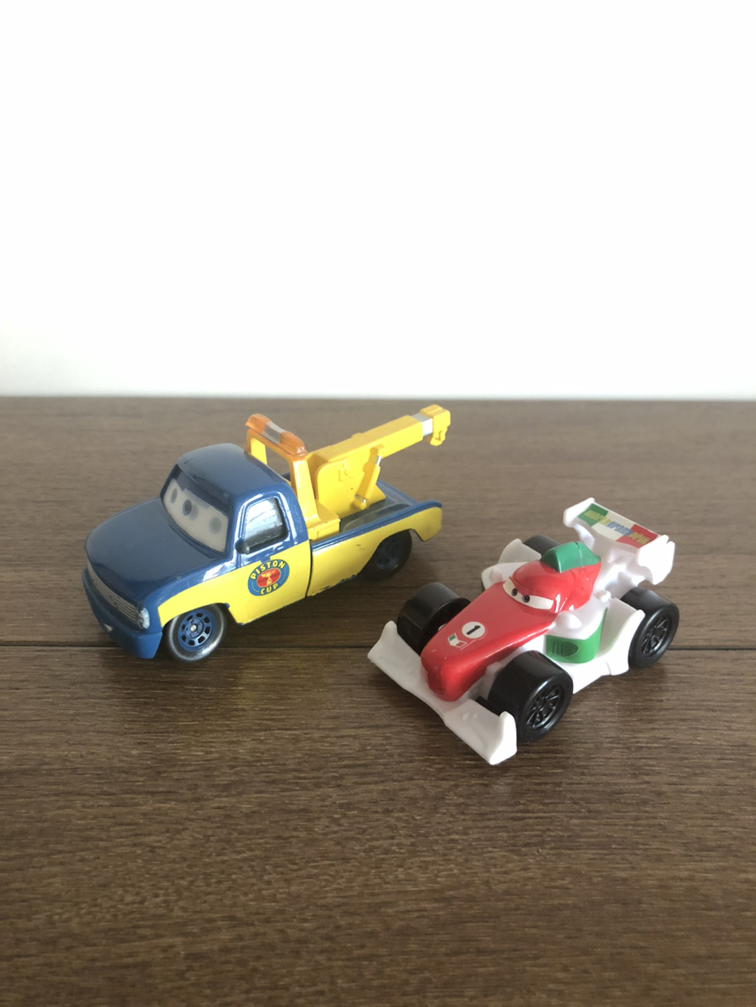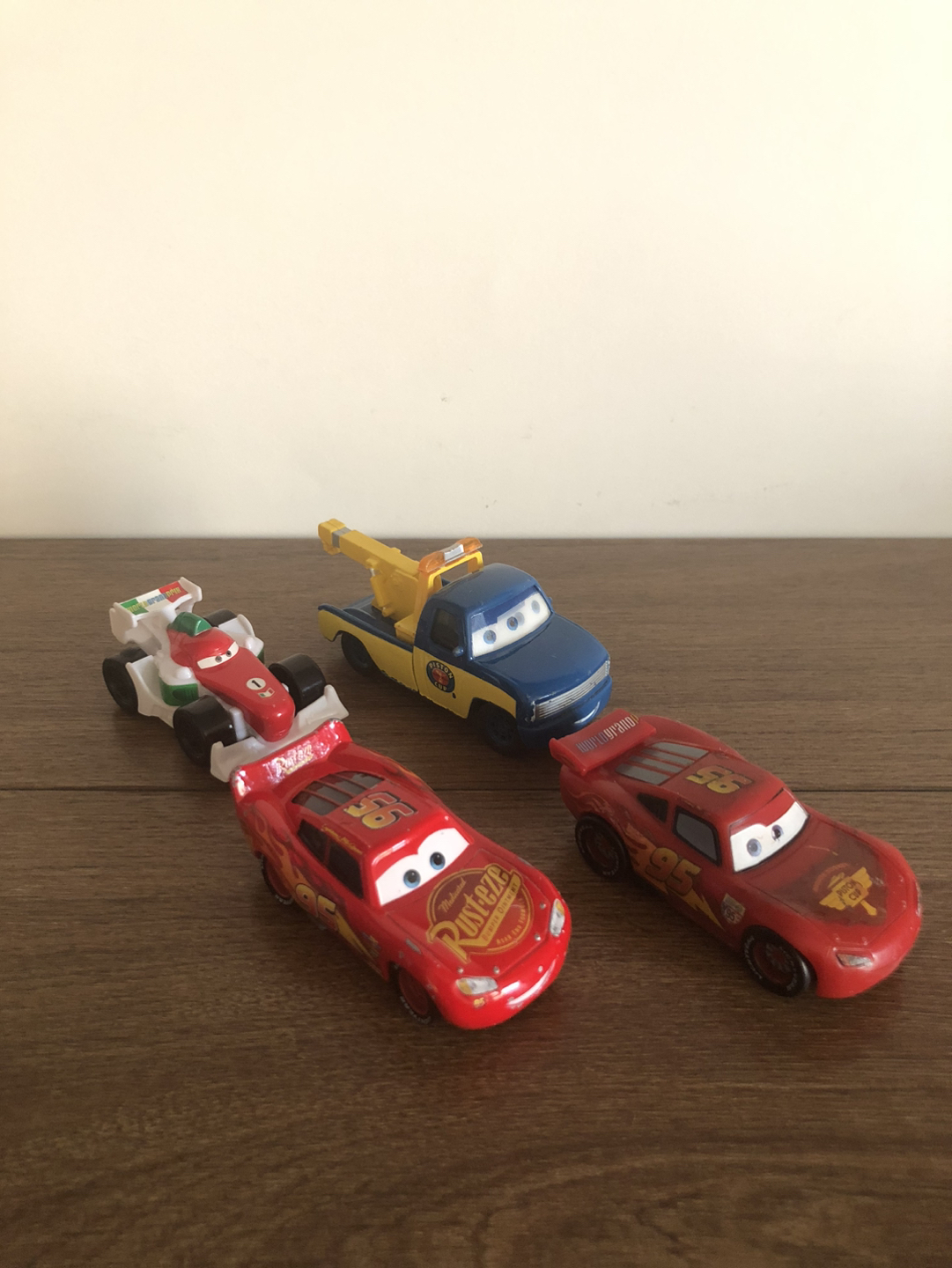 145A small lot of Pixar Cars toy cars. Come with 2 Lightning McQueen, Tow Truck Tom, and Francesco Bernoulli. Condition ranges. Located in Pickering