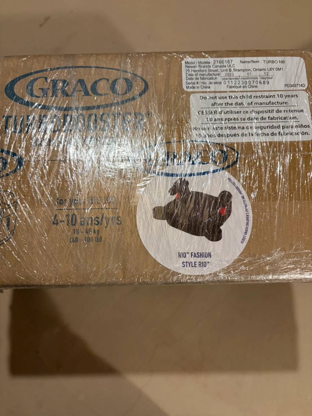 Graco Turbo NB booster seat in Rio Fashion Style Rio. For kids 4-10 years old, weighing 18-45 kg (40-100 lb). Do not use 10 years after manufacture date.