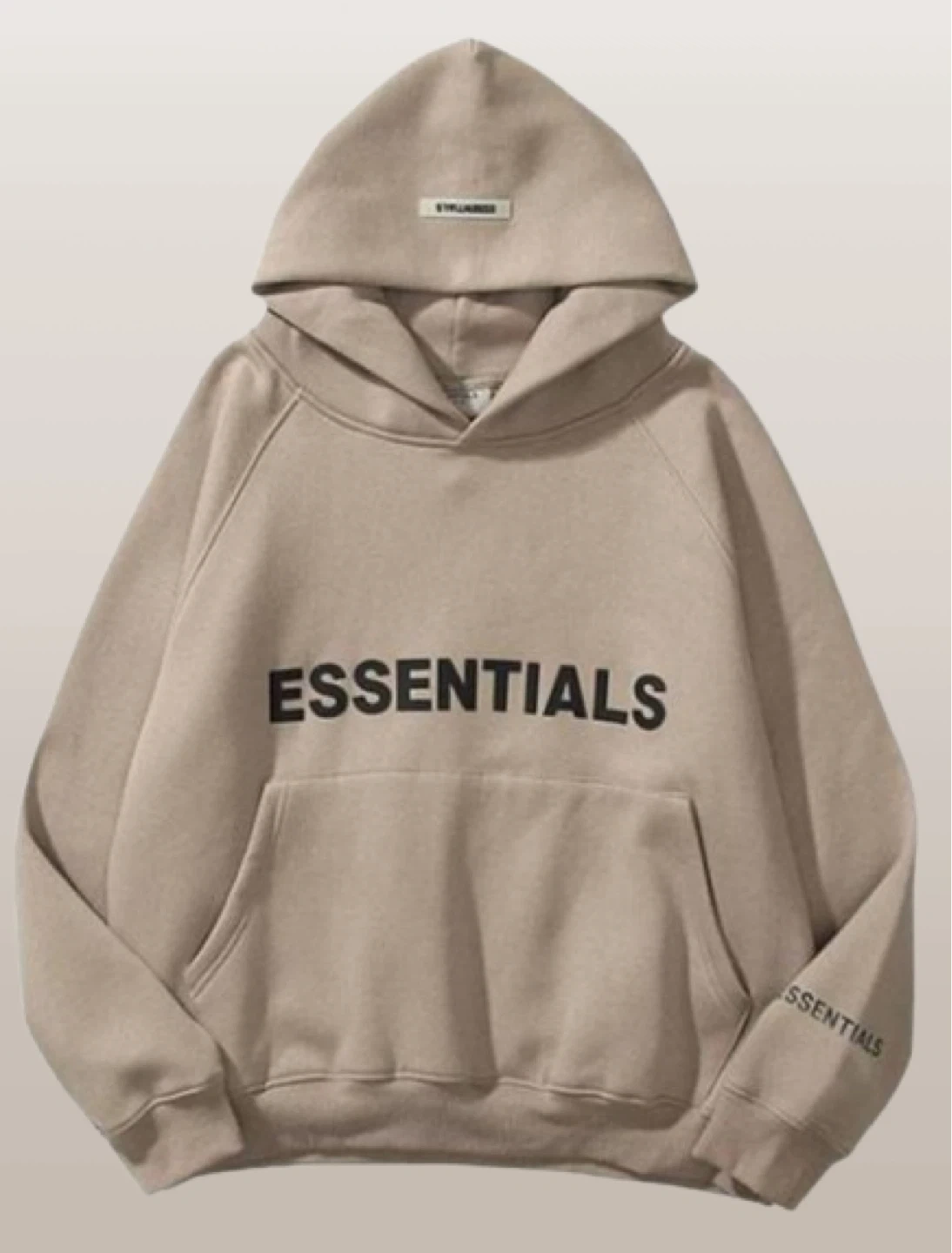 A beige ESSENTIALS hoodie with the brand name printed on the front and sleeve. It's a pullover style with a front kangaroo pocket. Made from a soft fabric blend.