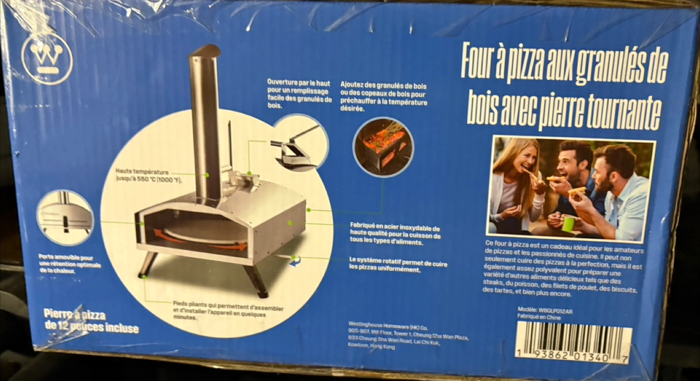 Outdoor wood pellet pizza oven. Heats up to 550°C (1000°F). Rotating system cooks pizza evenly. Easy to assemble. Includes 12-inch pizza stone. Multi-purpose.