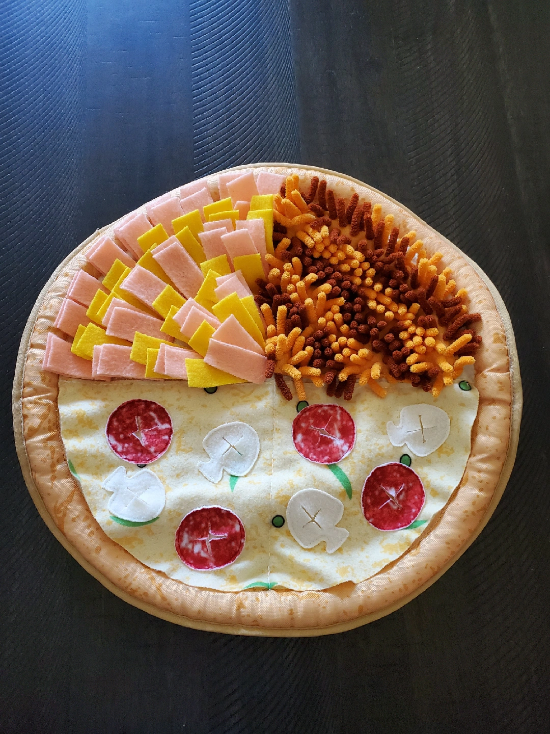 157This pizza snuffle mat is a fun way to engage your dog's sense of smell and provide mental stimulation. It's designed to look like a pizza with various toppings, and you can hide treats or kibble within the fabric for your dog to find. It's a great way to keep them entertained and slow down fast eaters. Used a couple times, excellent condition! Freshly washed and ready for another pup to enjoy!