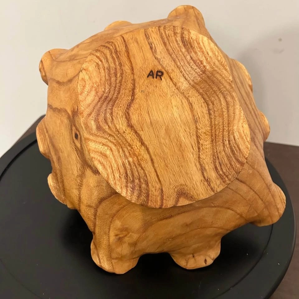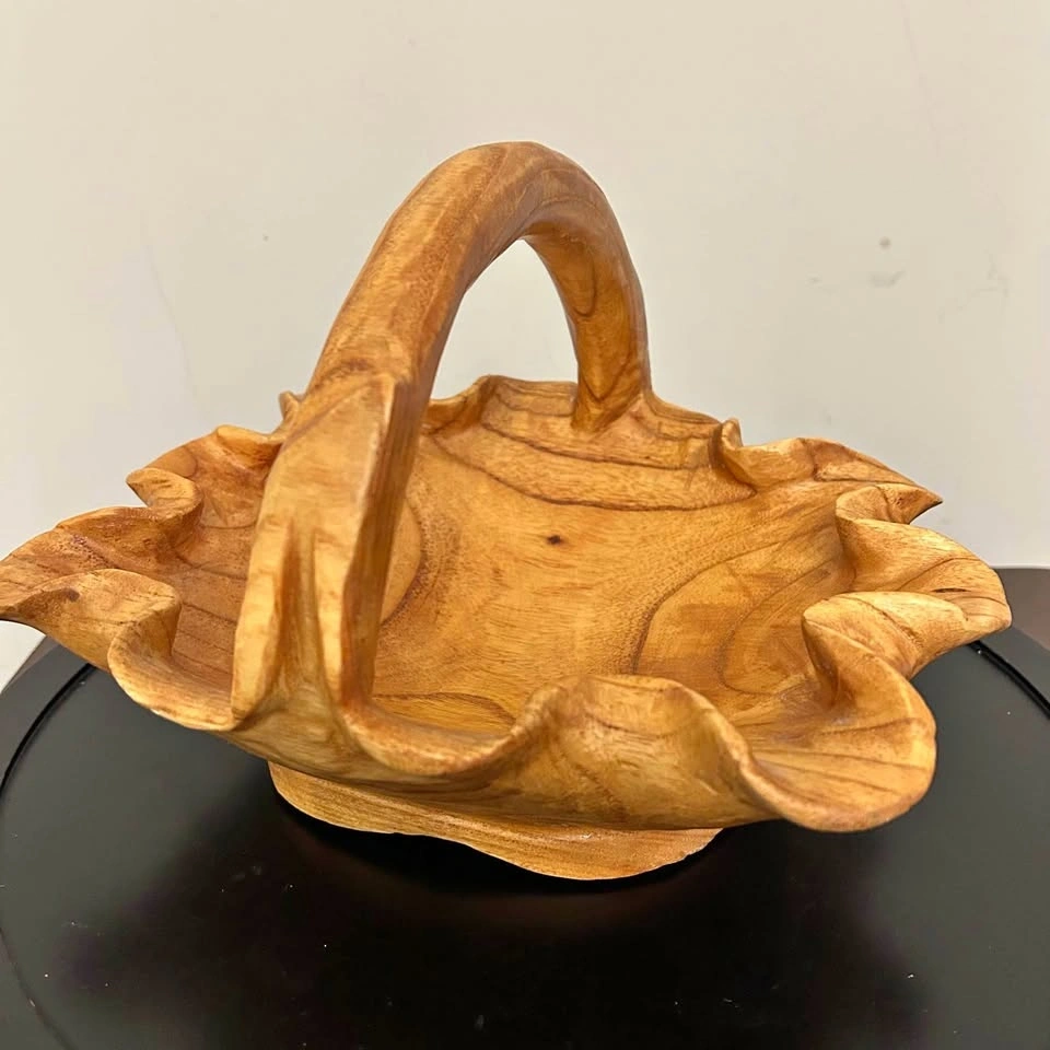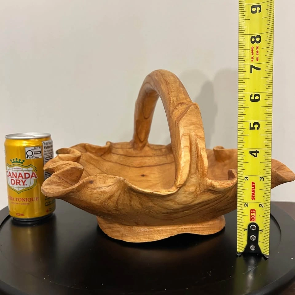 Beautiful artisan hand-carved Monkey Pod wood basket featuring a striking sculptural “wavy” live-edge rim. This is a substantial, solid wood piece with rich, high-contrast natural grain that highlights the organic beauty of the material. The design incorporates a smoothly carved integrated handle, giving the piece both functionality and a strong decorative presence. The flowing form and craftsmanship make it equally suitable as a centerpiece, fruit bowl, or display object. Signed on the base with initials “AR,” adding to its uniqueness and collectible appeal. A versatile piece that fits seamlessly into Mid-Century Modern, boho, tiki, or rustic interiors, and a great find for collectors of handcrafted wooden art. Condition is excellent vintage, with a smooth satin finish and no cracks, chips, or drying. Pick up in the Seton area, Calgary. Cash or e-transfer accepted. See my other listings! Feel free to message if you have any questions!