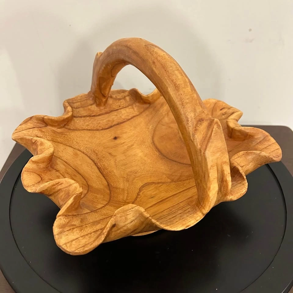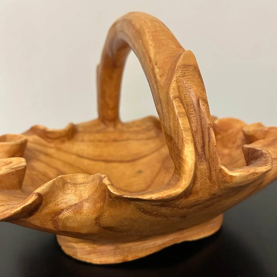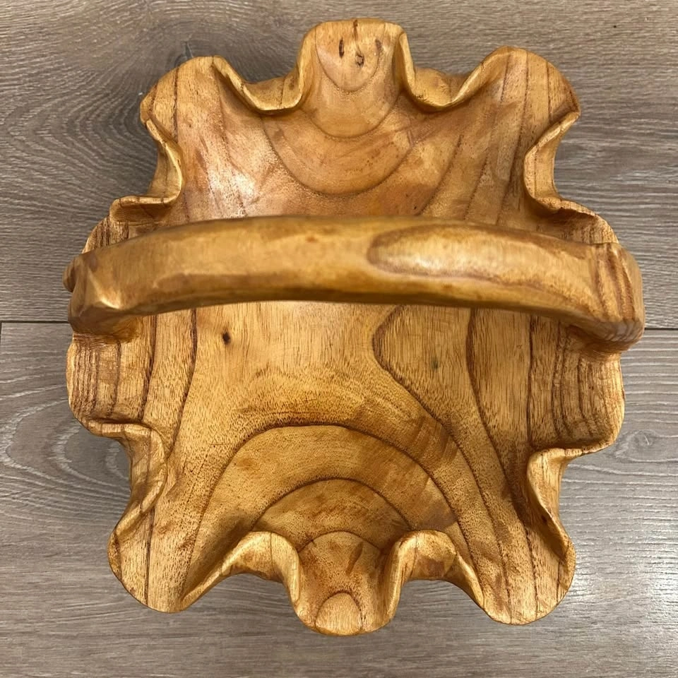 Signed Hand-Carved Monkey Pod Wood Basket – Sculptural Wavy Bowl