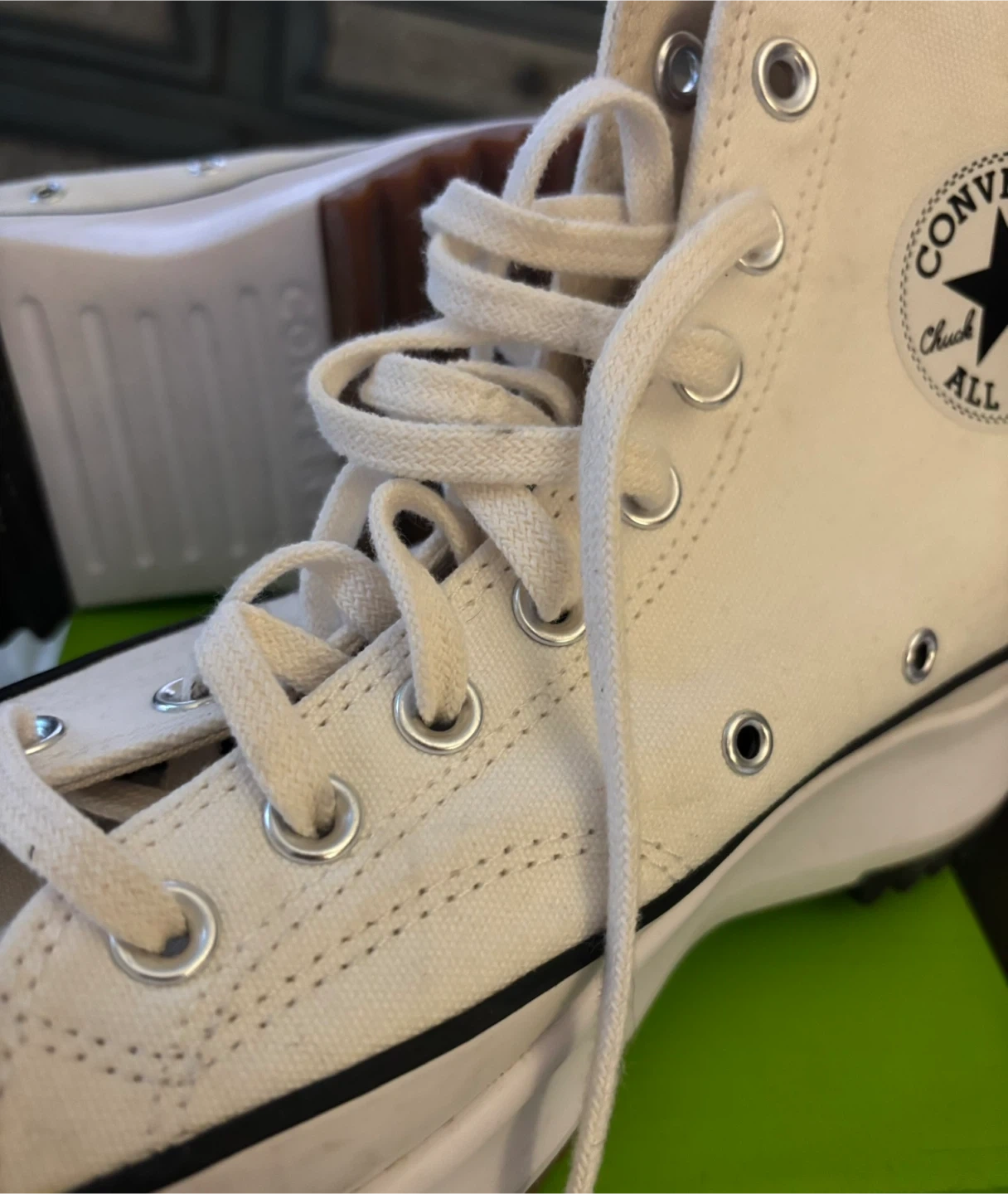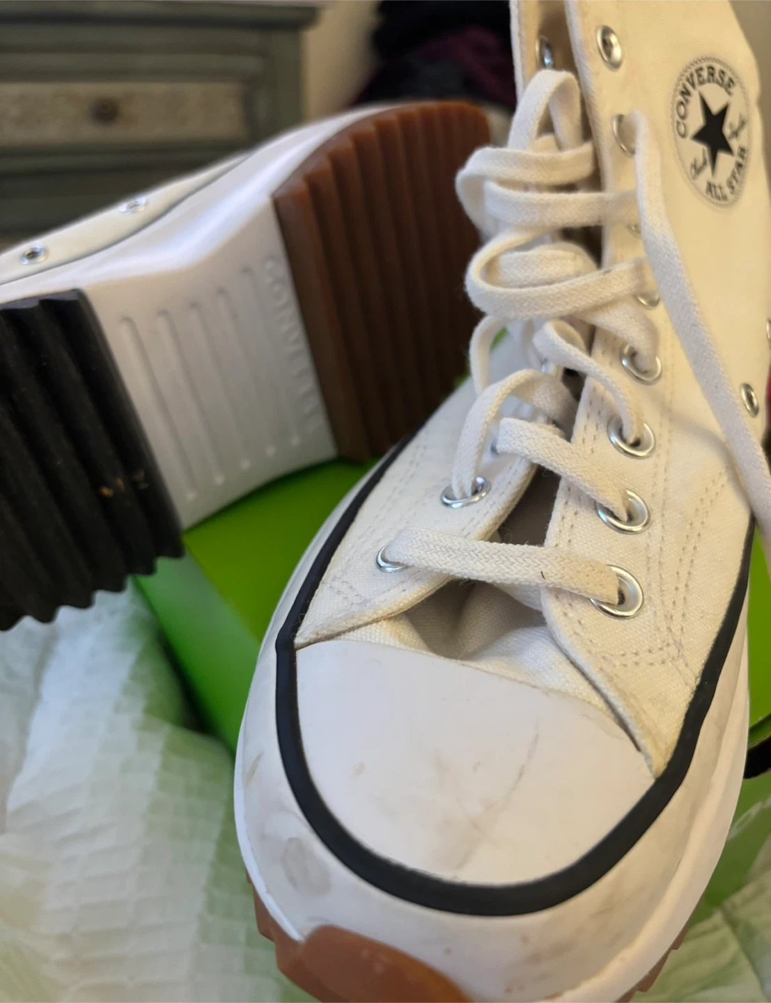 White canvas Converse Run Star Hike high top sneakers. These shoes have a platform sole and the classic Chuck Taylor All Star logo patch. They're canvas material with a rubber sole. Women’s 9.5