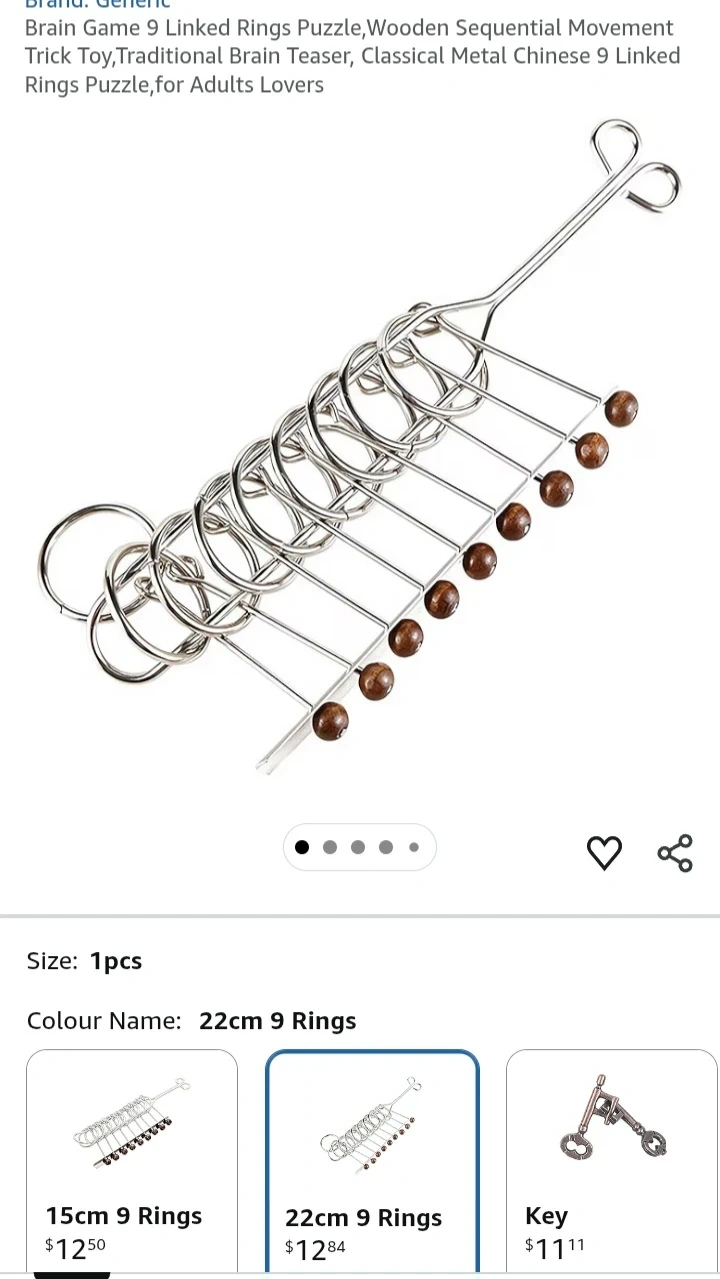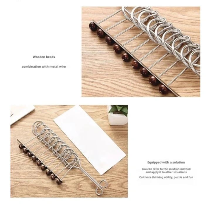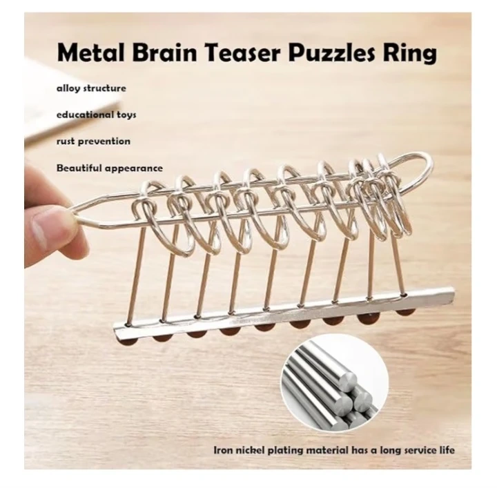 This is a metal brain teaser puzzle ring with an alloy structure. It features rust prevention and a beautiful appearance. The puzzle is educational and made with iron nickel plating material for a long service life. This is a classic Chinese 9 linked rings puzzle.