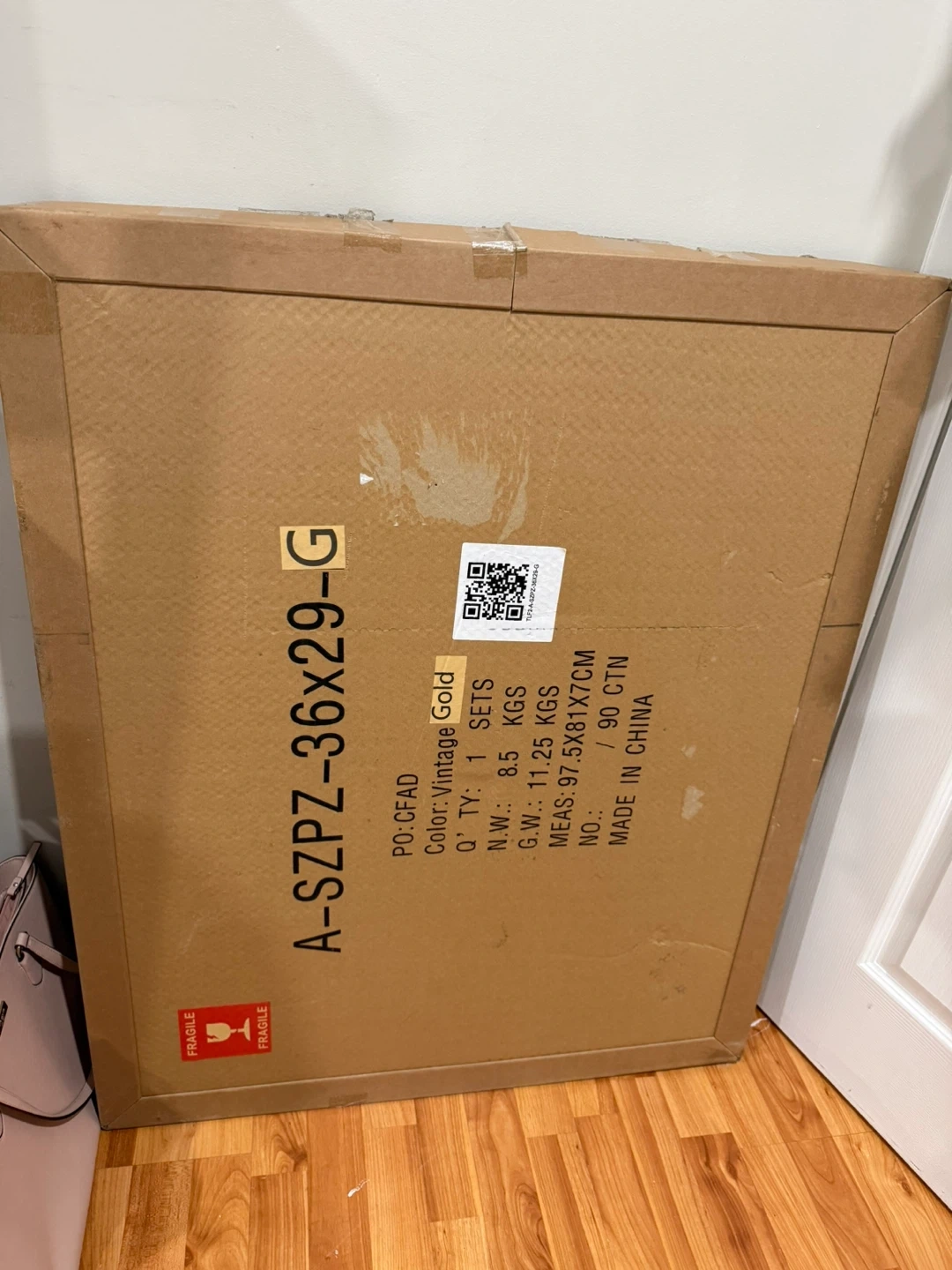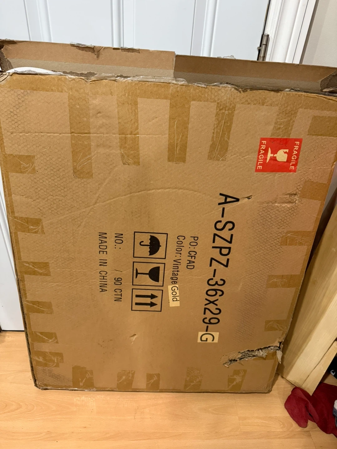 Box was only opened to make sure mirror was not damaged. Accidentally bought two. Solid quality mirror that goes great in bedrooms, living rooms, bathrooms or over a fireplace