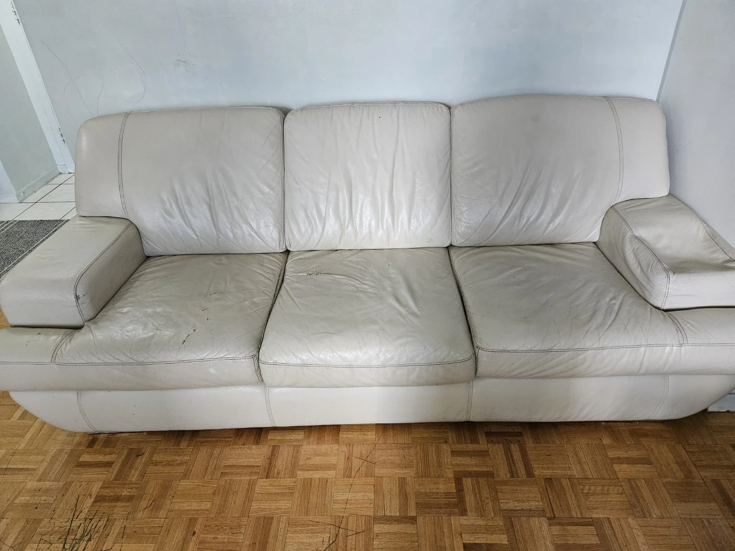 Pick up only, a comfy beige leather three-seater sofa. It has some wear and tear, as you can see in the pictures, but it's still got lots of life left in it! Perfect for a living room or den.