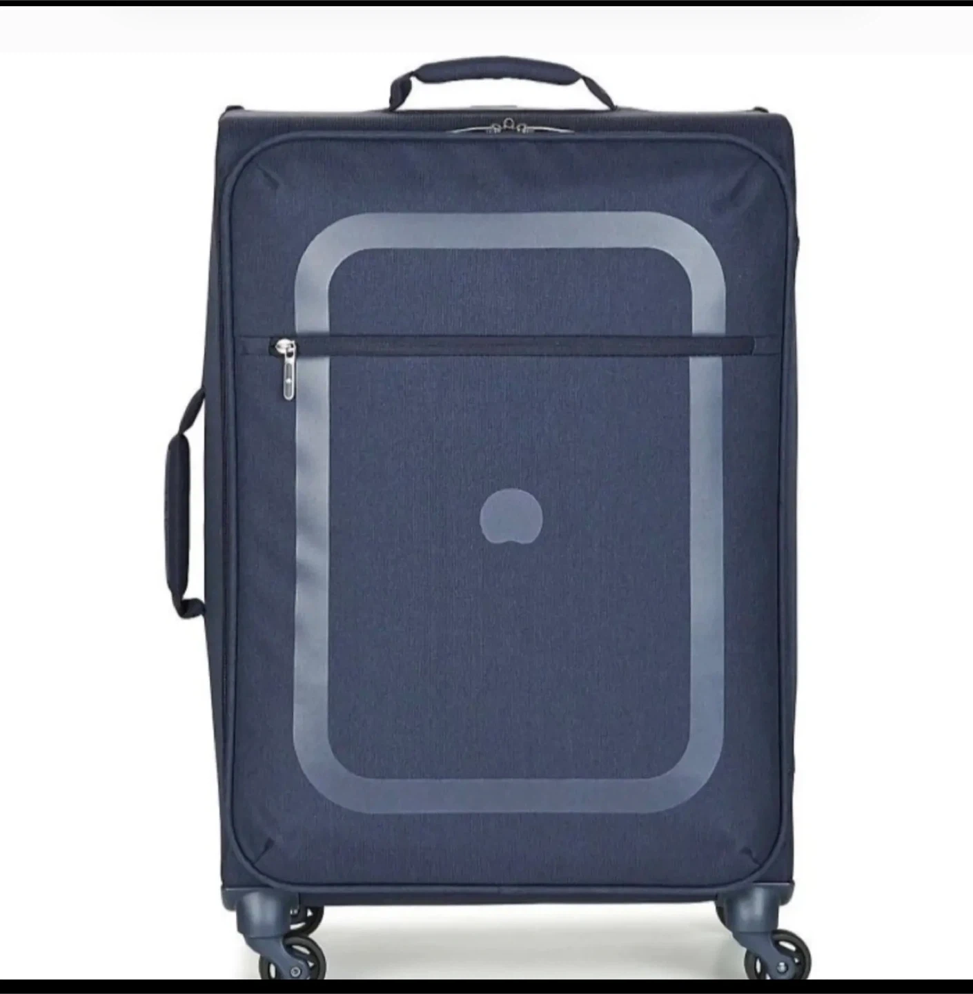 Delsey navy blue luggage, perfect for your next trip! It's a soft-sided suitcase with wheels. This bag has a zippered front pocket for easy access to essentials. It's lightweight and durable.