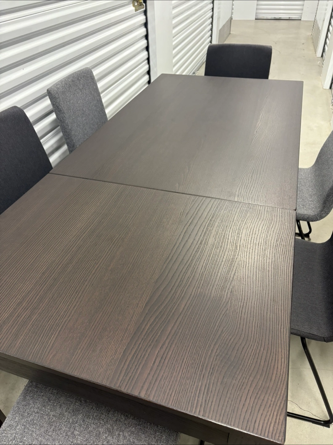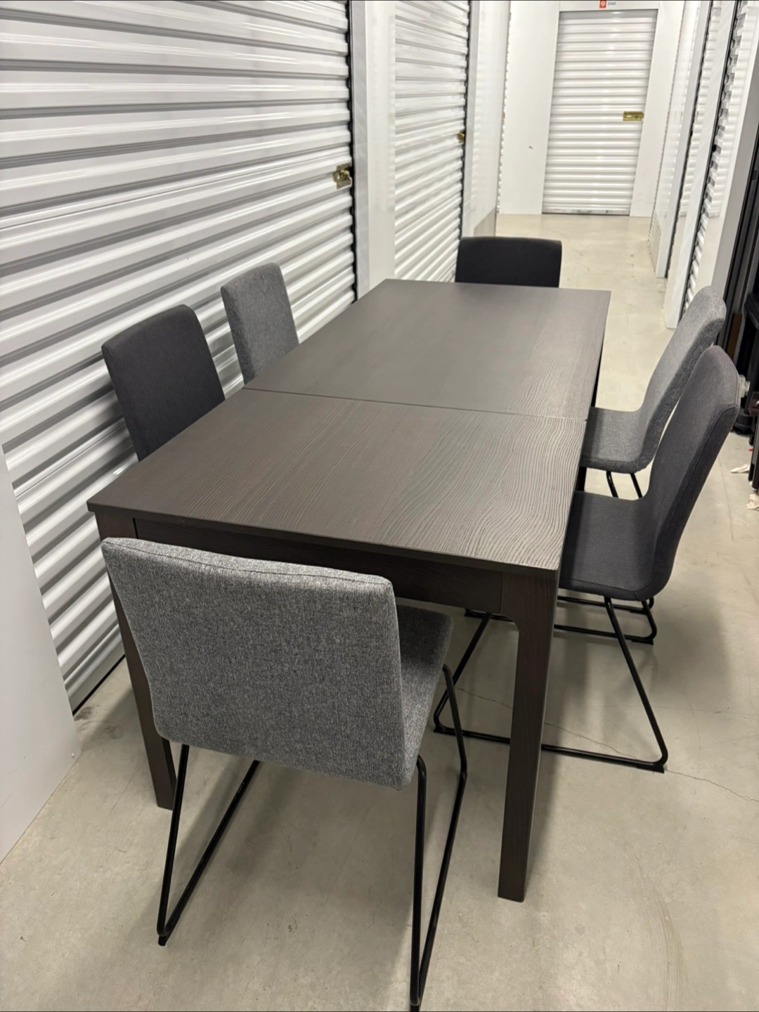 Ikea Ekedalen solid wood extendable table and 6 chairs (3 light grey and 3 dark grey)—all in pretty good condition. The table sits 6 people very comfortably, 8 if you squeeze a bit.