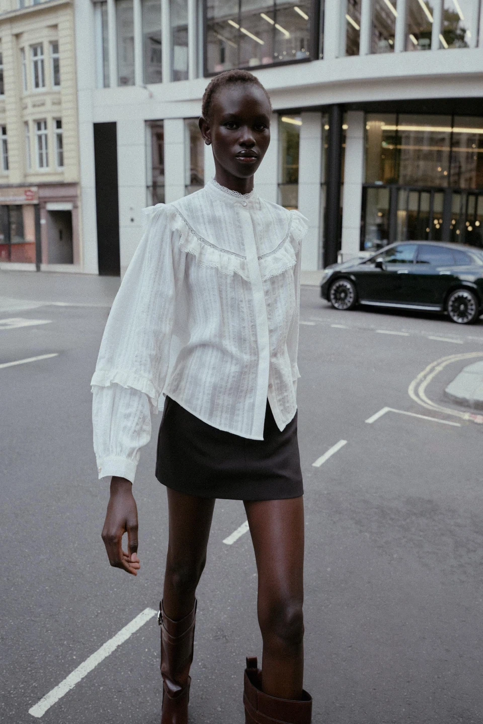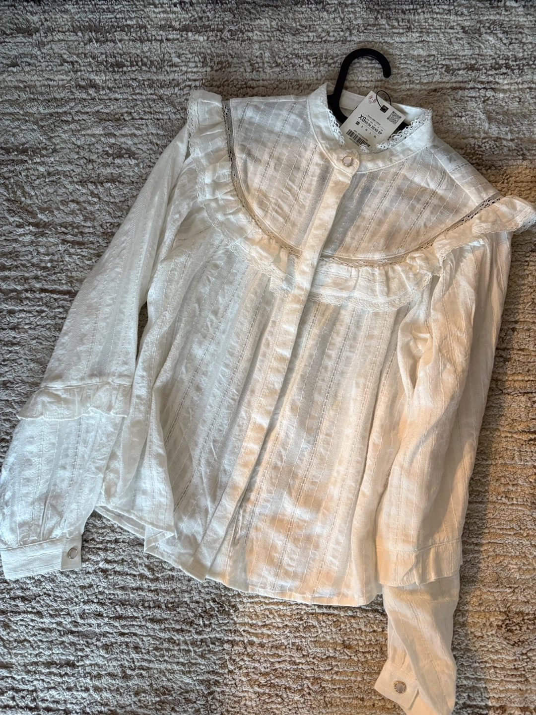 Beautiful white blouse with delicate ruffles and lace detailing. It's a long-sleeved button-up style with a gathered neckline.