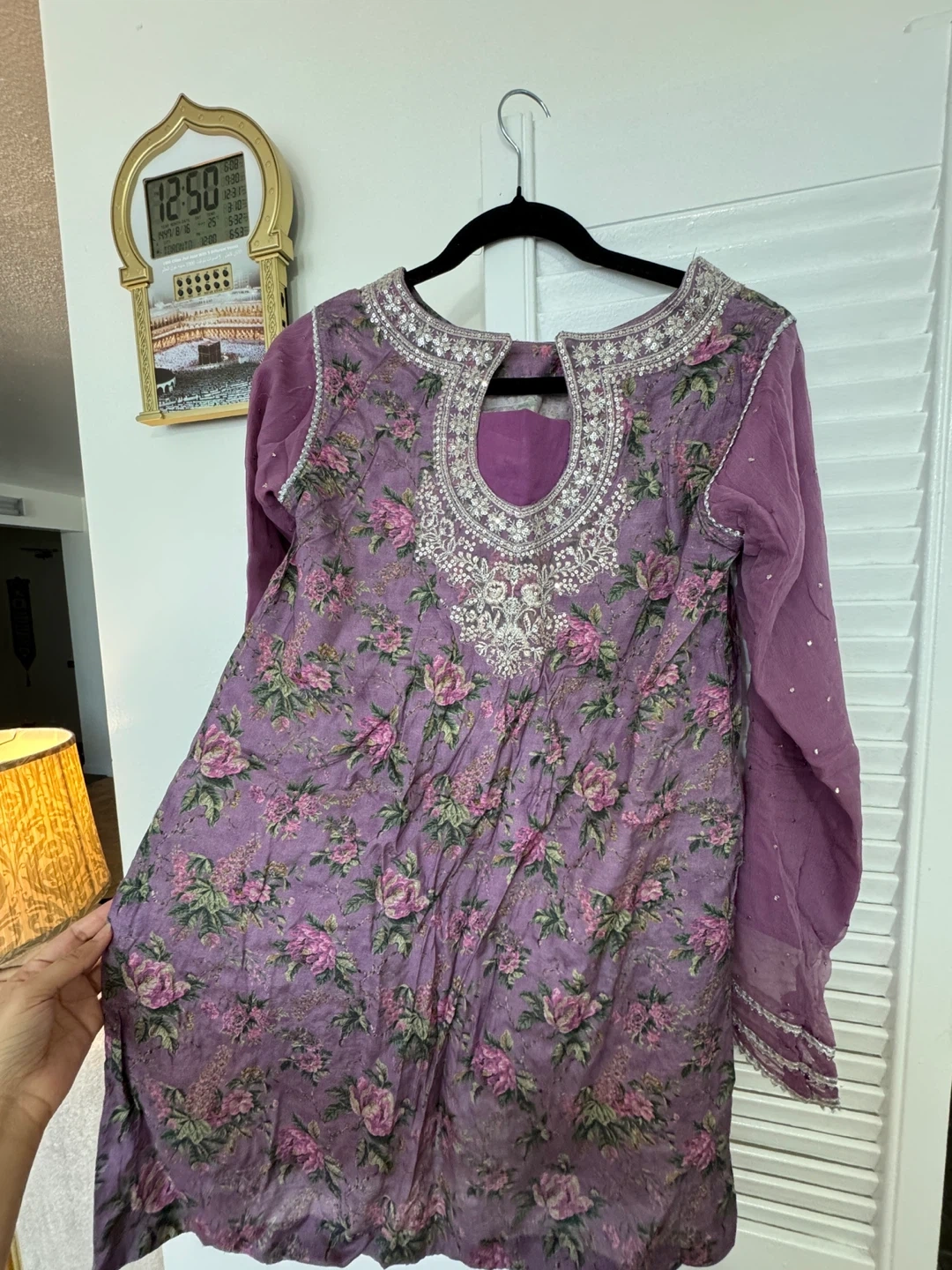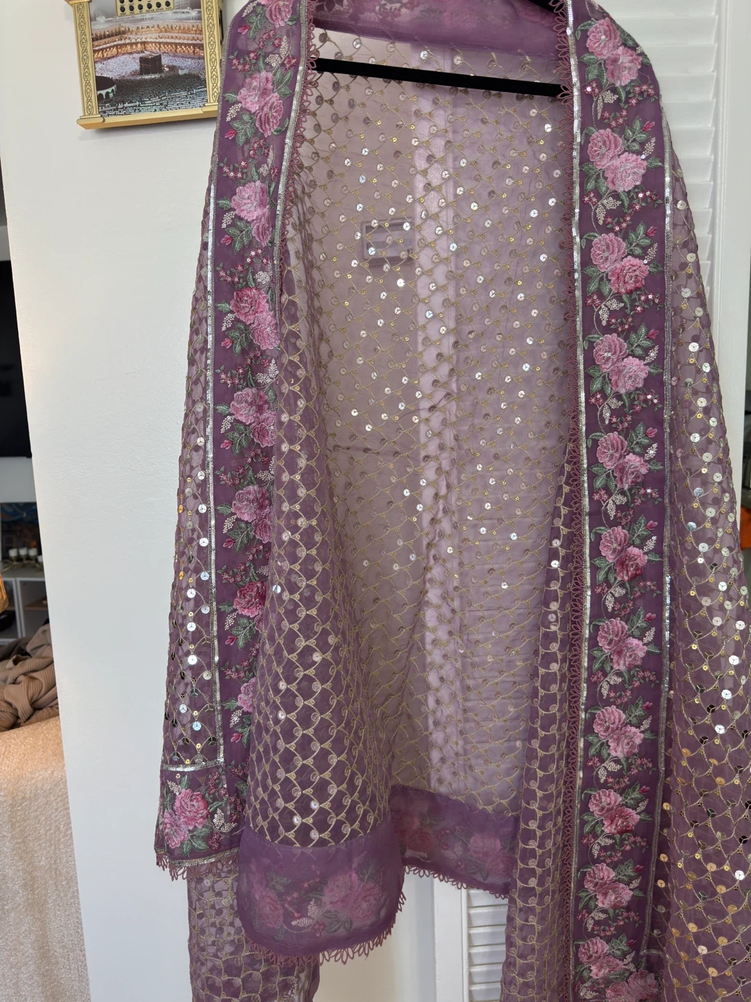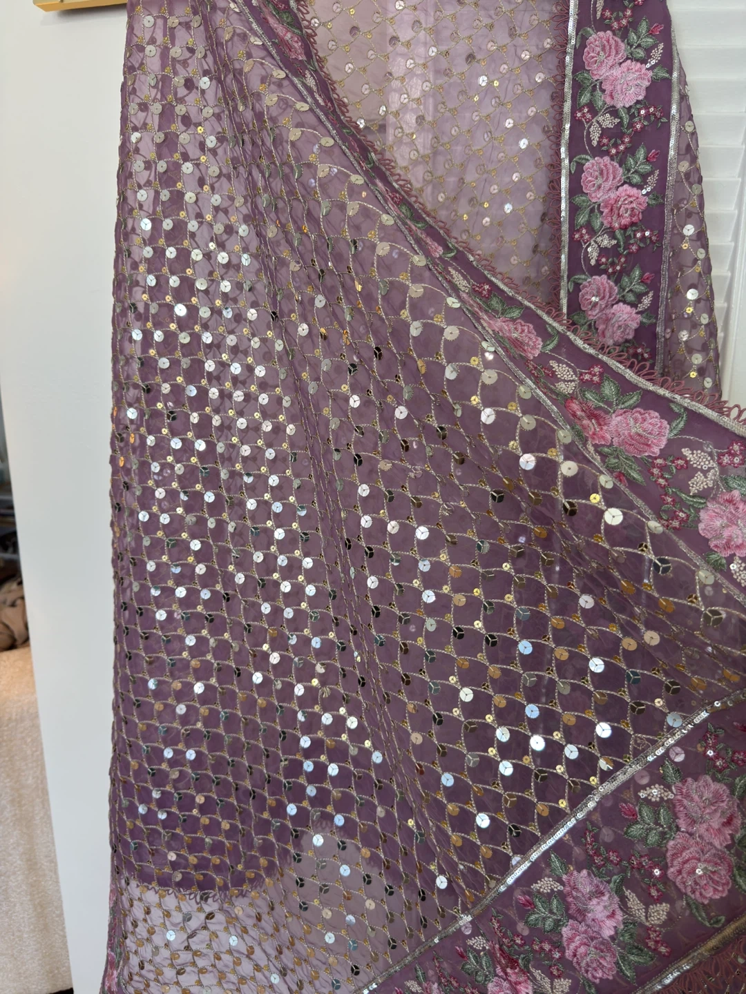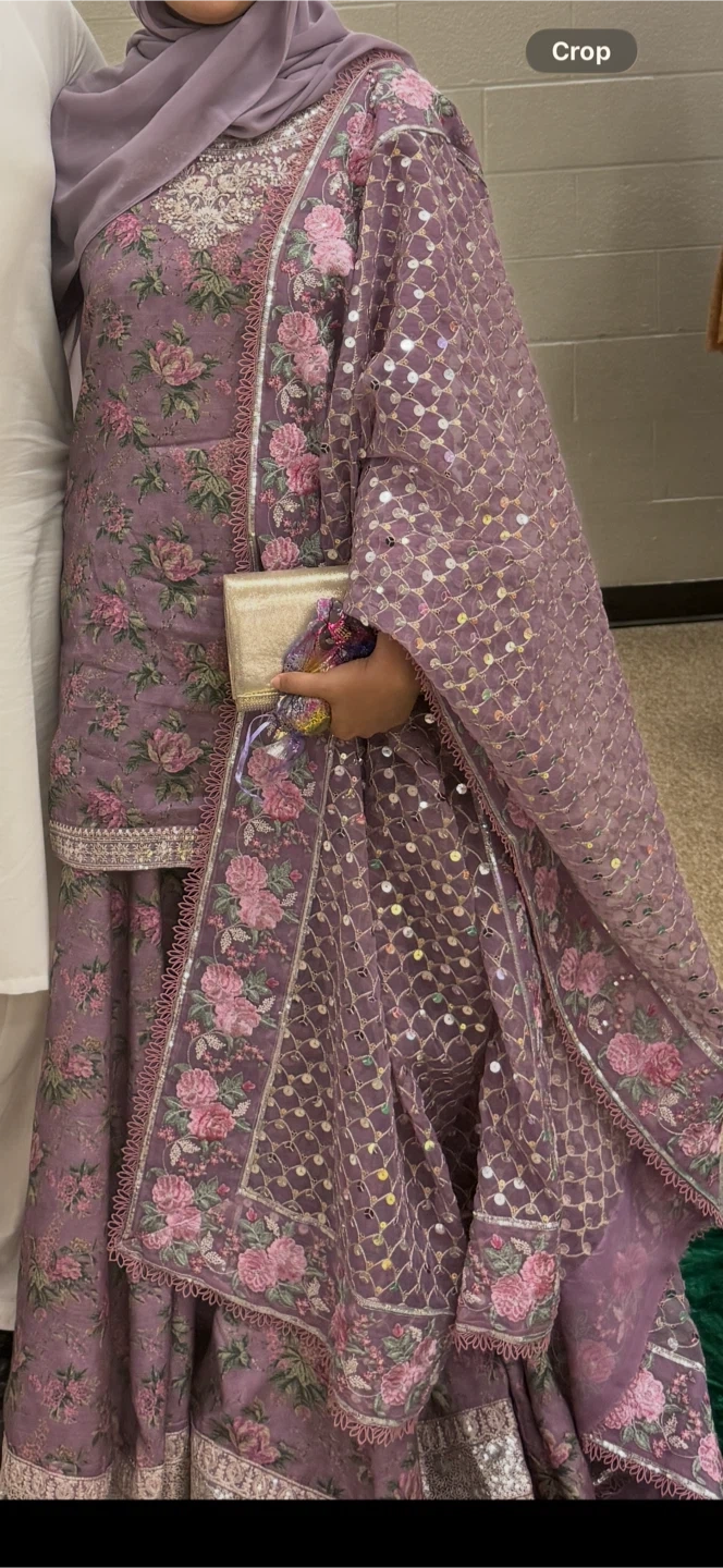 This is a beautiful purple outfit featuring a floral print. It includes a matching dupatta heavily embellished with sequins. It's perfect for special occasions!