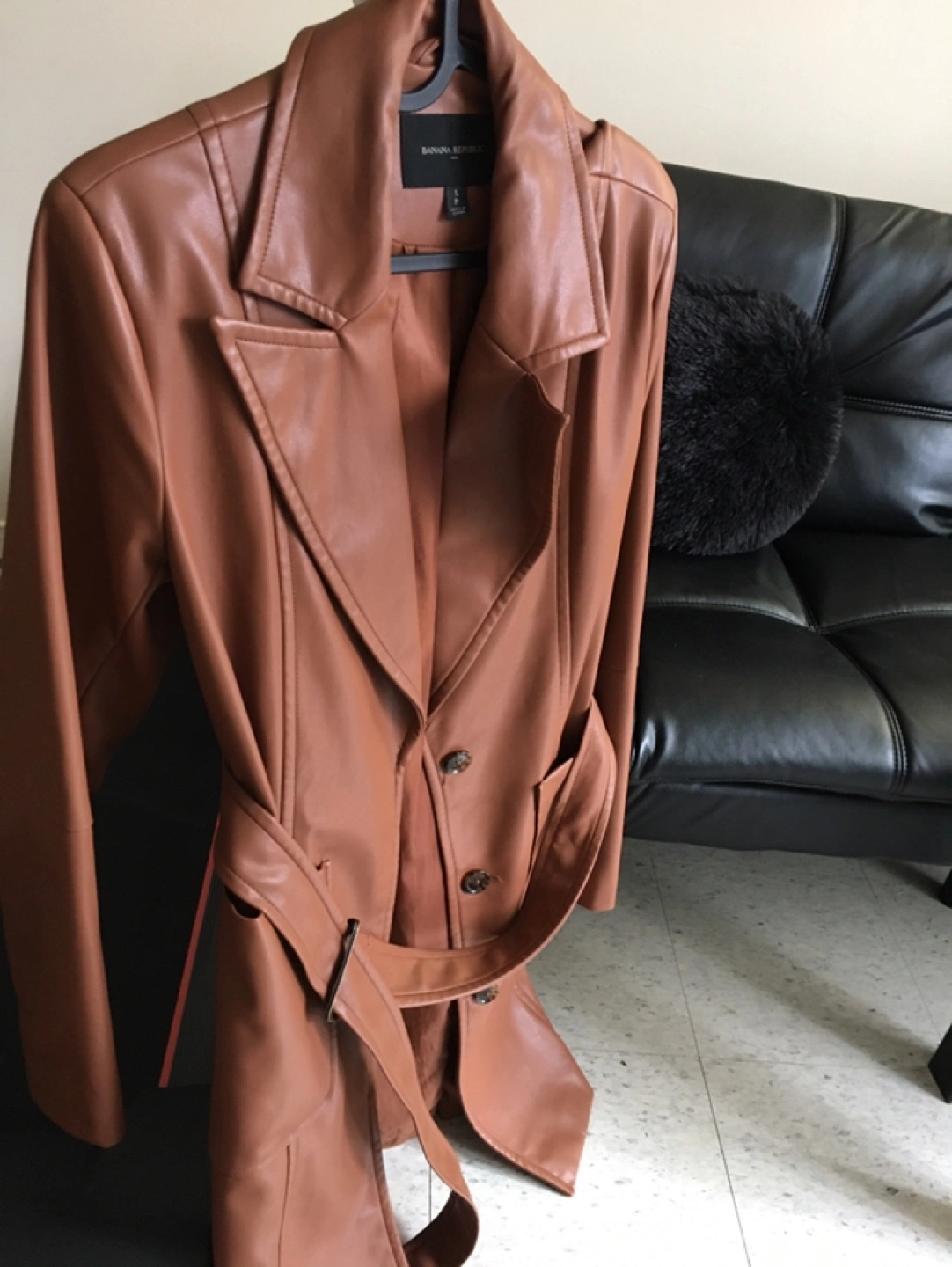 Brown faux leather trench coat by Banana Republic. It's a size small with a belt and button closure. Looks sharp!