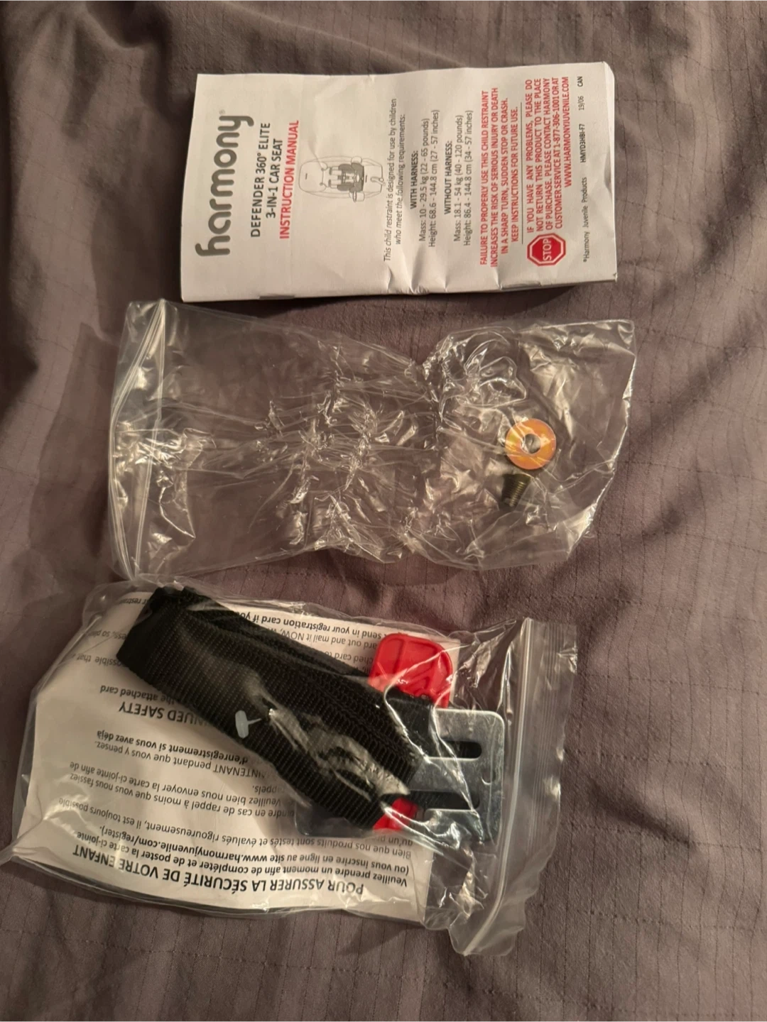 Harmony Defender 360 Elite car seat with built-in harness system. Suitable for children weighing 10 to 29.5 kg (22-65 lbs) in harness mode. Booster seat mode for children 18-54 kg (40-120 lbs). Includes original packaging and accessories.