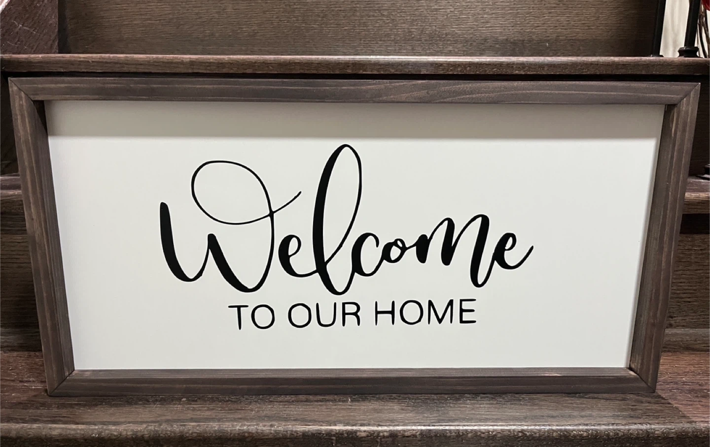 A cute sign to welcome guests into your home! It's a rectangular sign with a dark brown wood frame and "Welcome To Our Home" written in black lettering